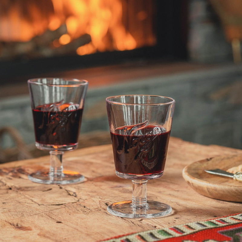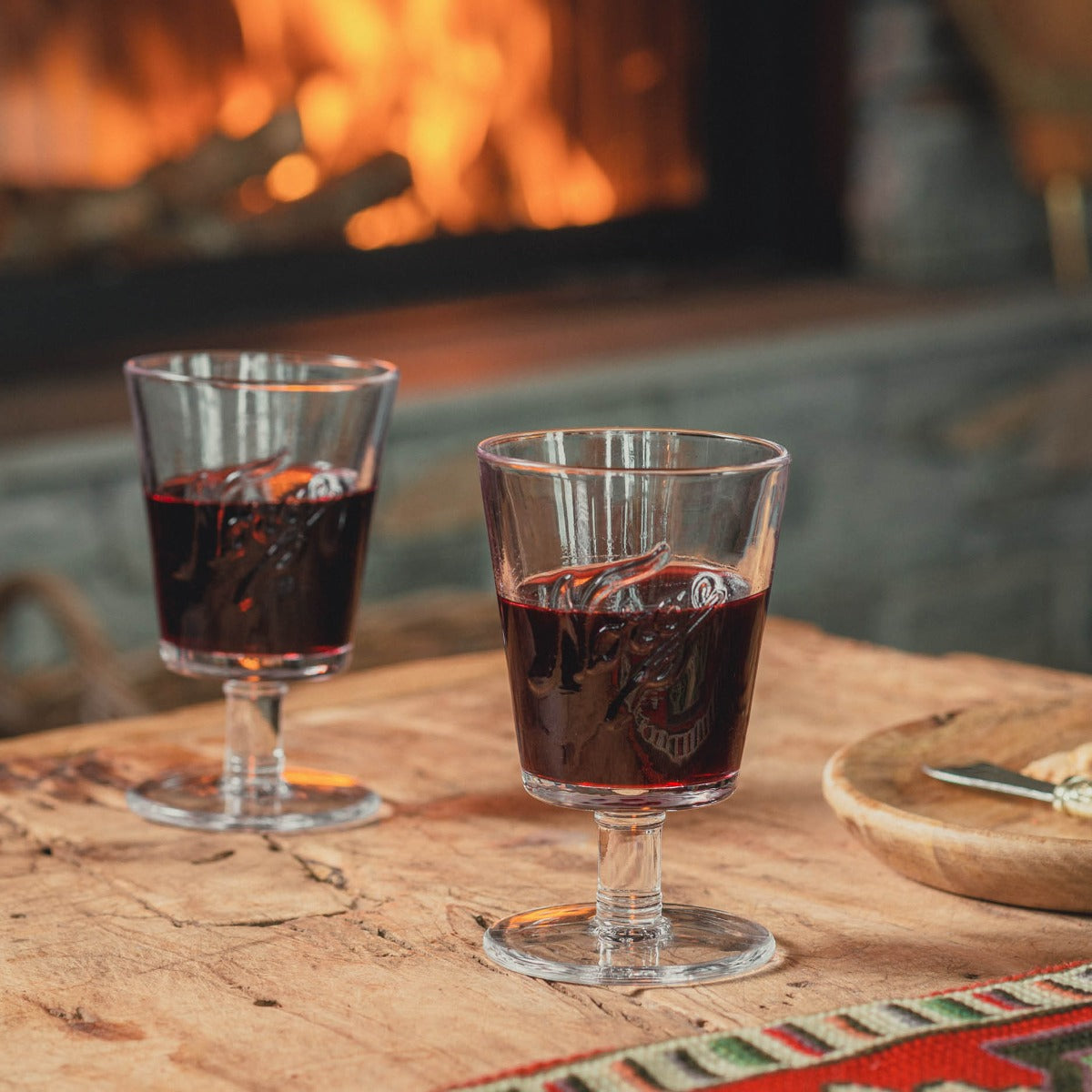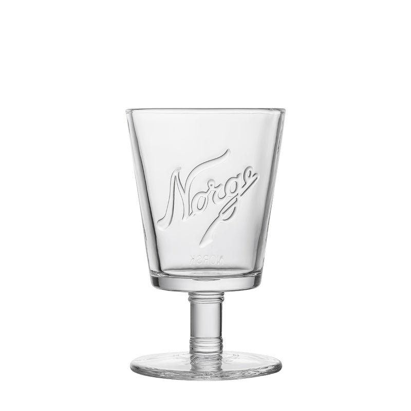 Glass på stett med den velkjente Norge-logoen. Robuste glass med rustikt uttrykk, like flotte til borddekking som til peiskosen. Rommer 2 dl. Leveres i 4-pakning.