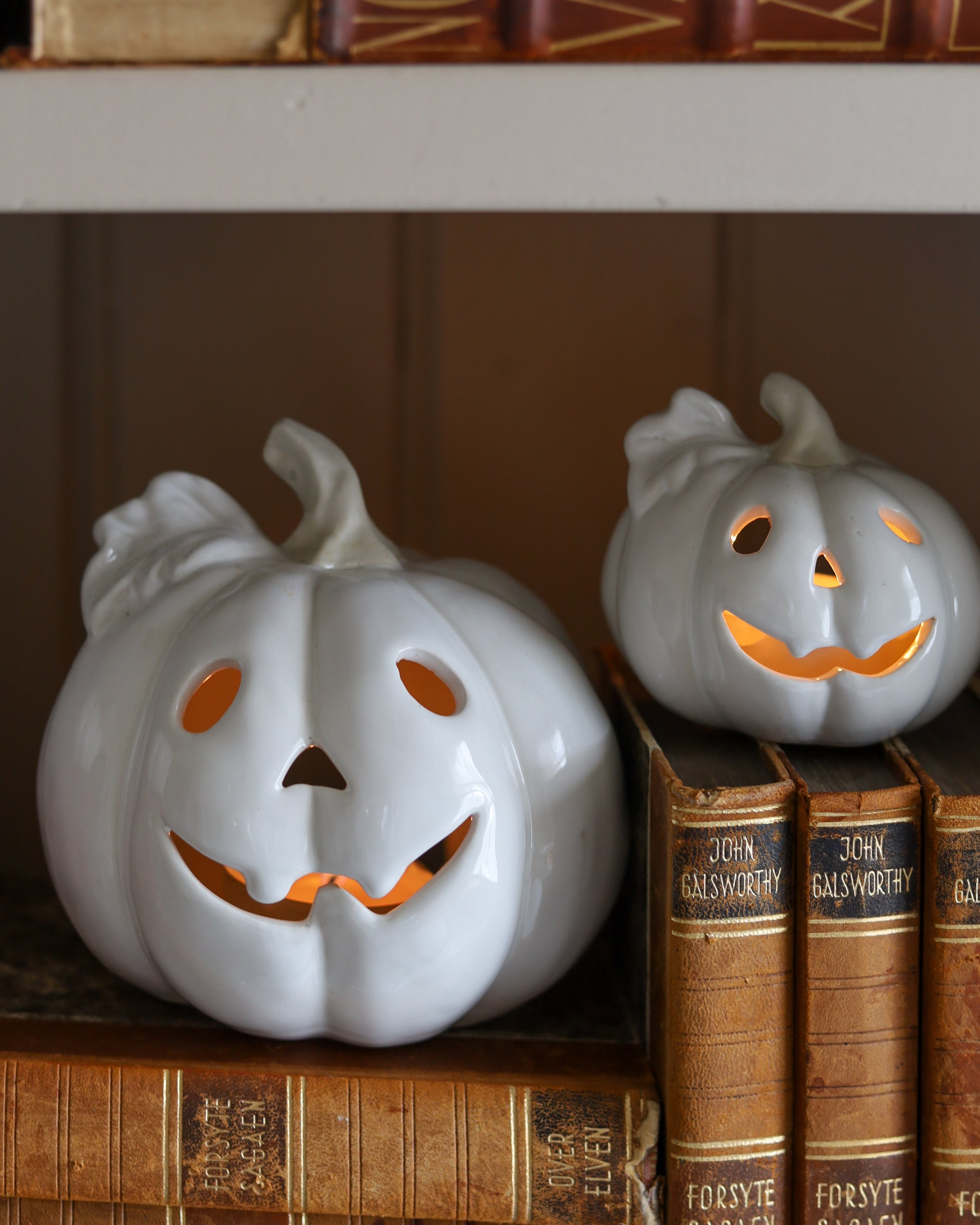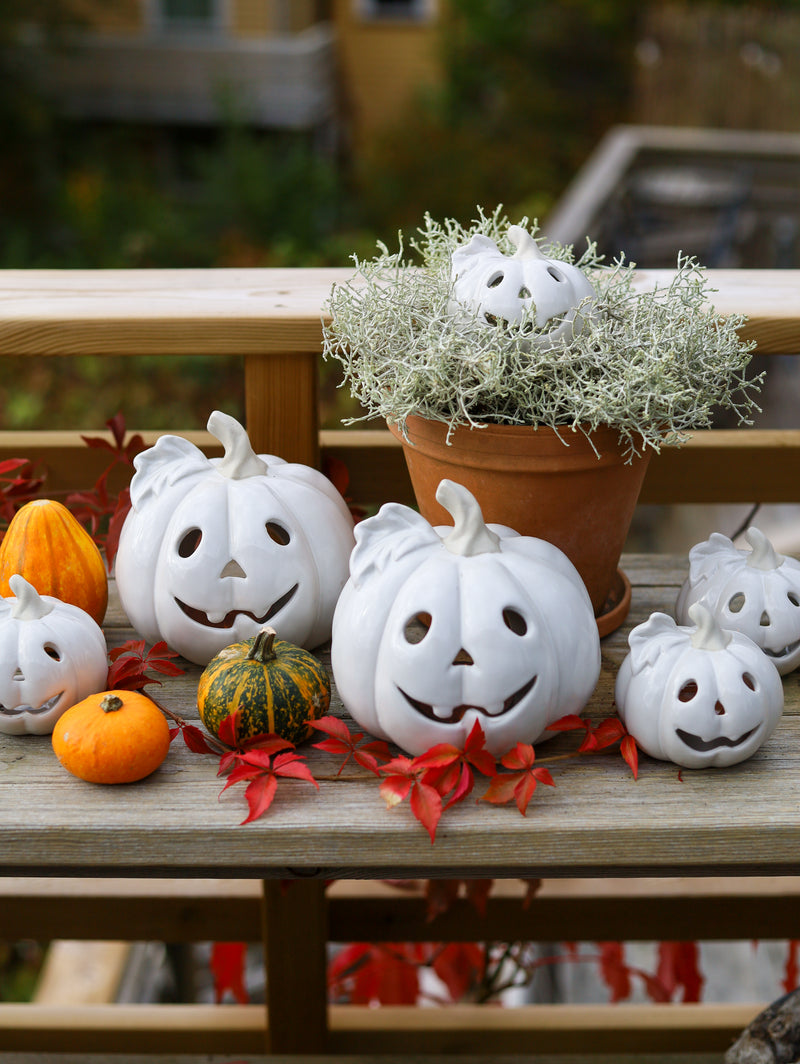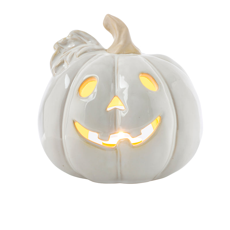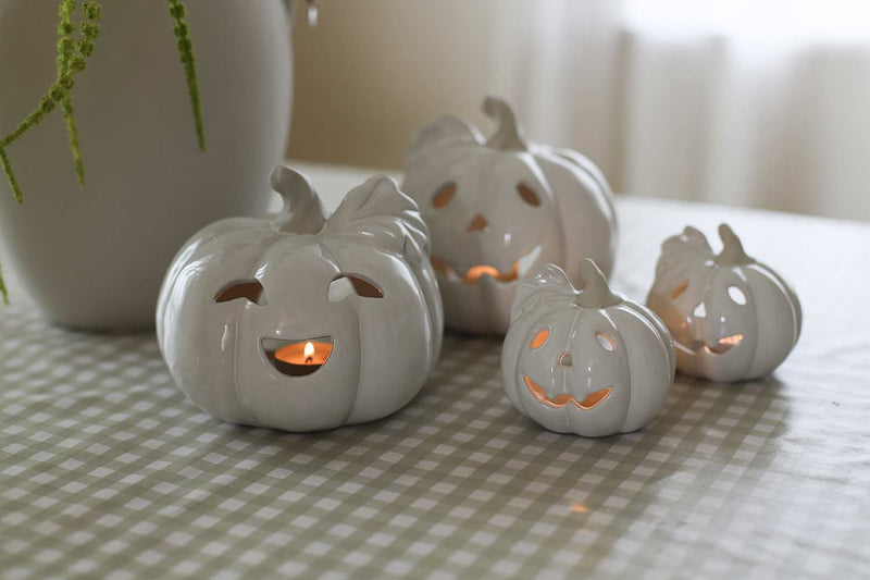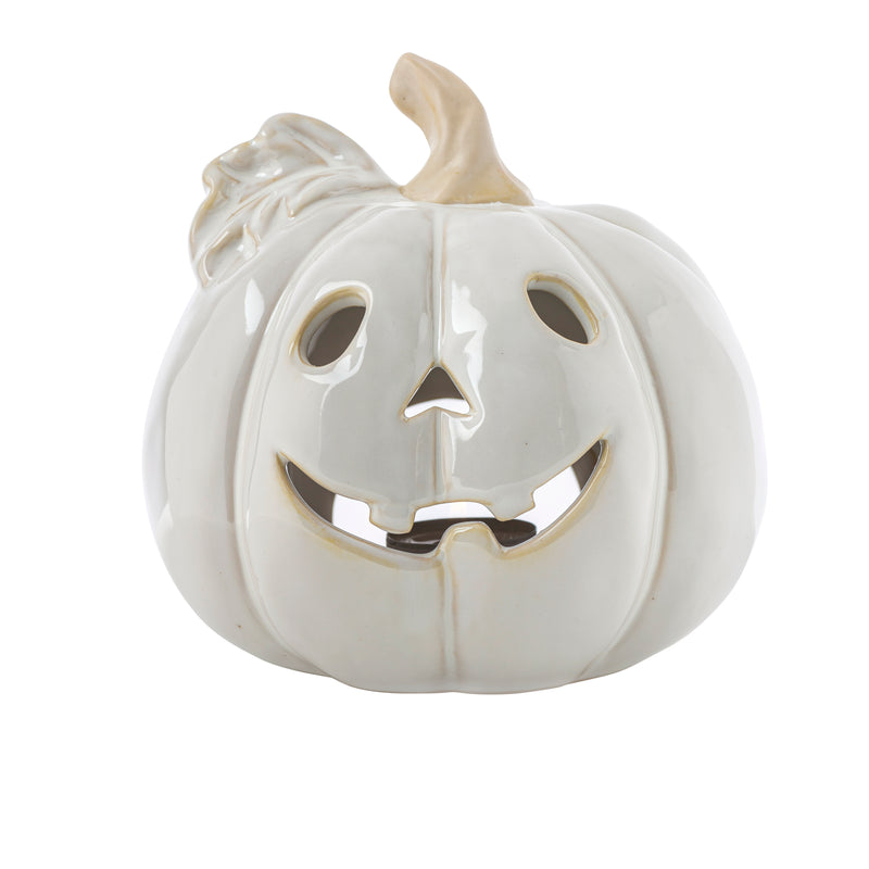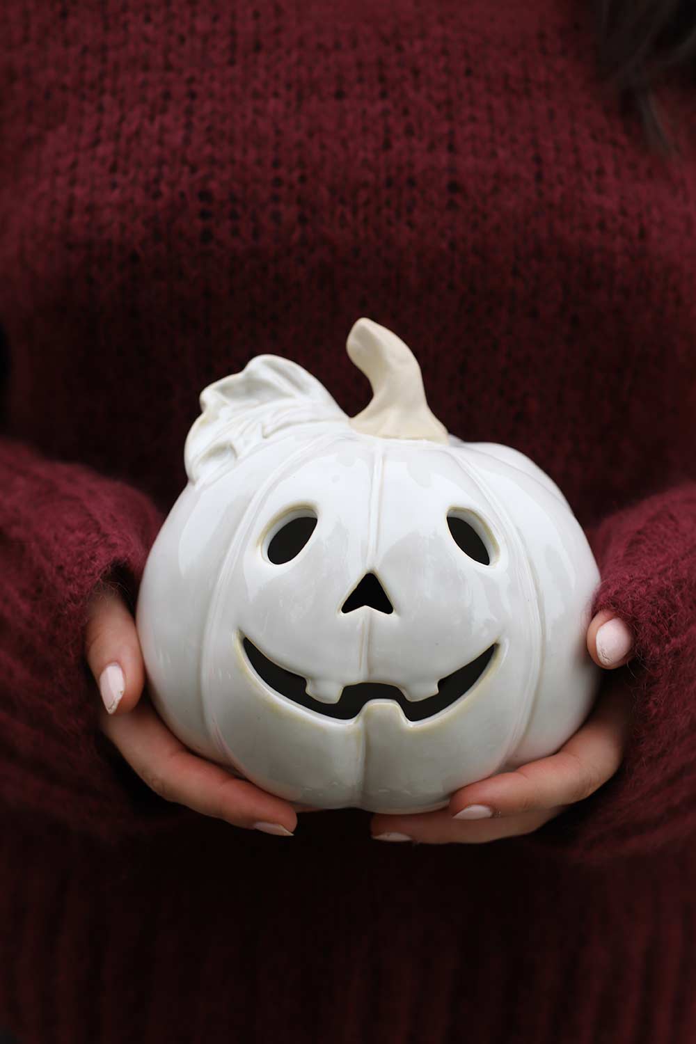En stemningsfull lyslykt formet som et gresskar i keramikk, 15 x 14,5 cm. Den gir et varmt og koselig lys, og blir en naturlig del av høstens interiør og borddekking.