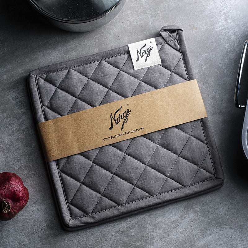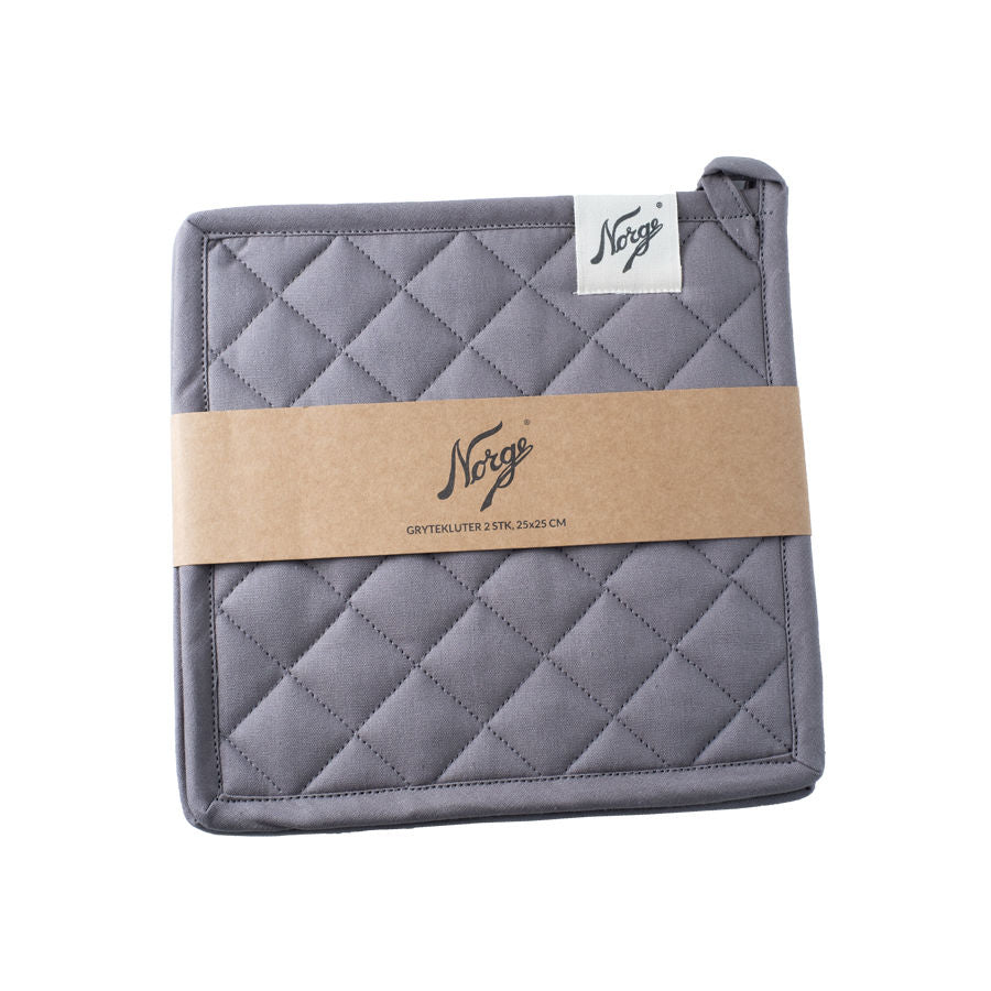 Gode grytekluter økologisk bomull med hempe til å henge de opp i. Stoffet er gjennomfarget i en varm grå farge som matcher godt med de fleste andre farger. De er kvadratiske på 25 cm.