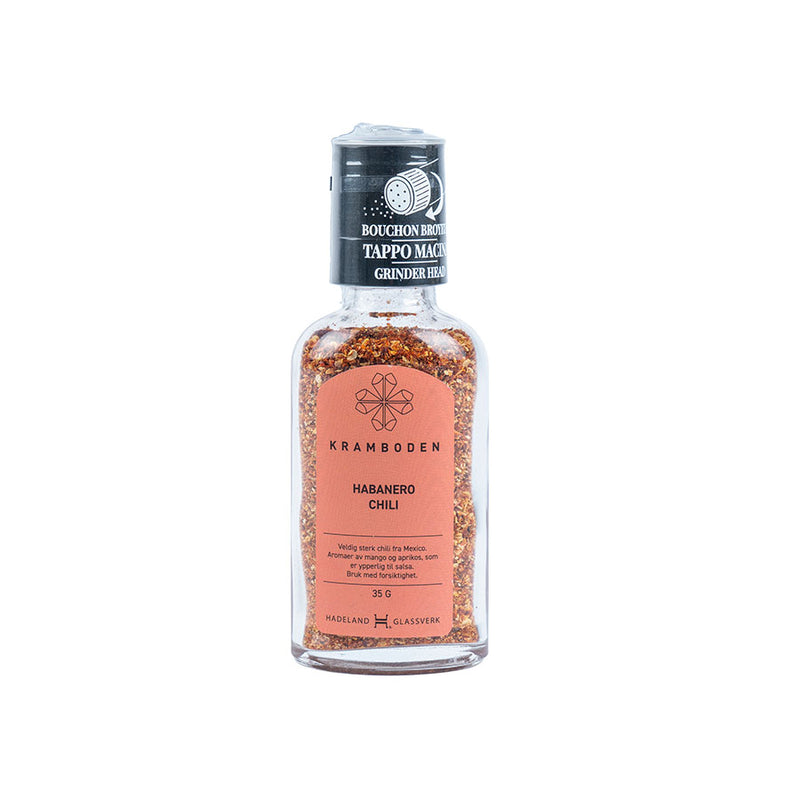 Habanero chilikrydder fra Kramboden, 45 gram. Denne chilitypen kommer fra Mexico og er veldig sterk, med en aroma av mango og aprikos. Passer derfor utmerket til bruk i salsa.