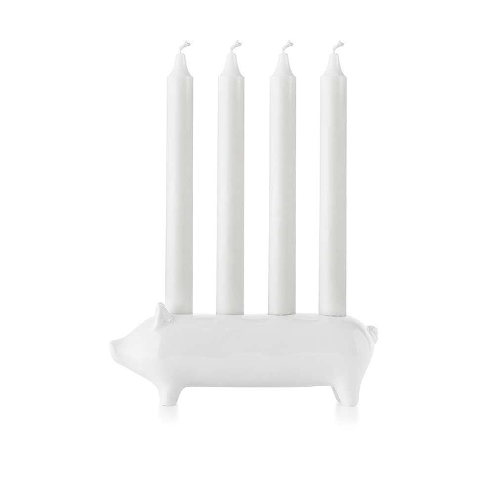 En adventsstake med lekent uttrykk – formet som gris og laget i hvitt porselen. En nostalgisk og koselig måte å telle ned dagene til jul på.