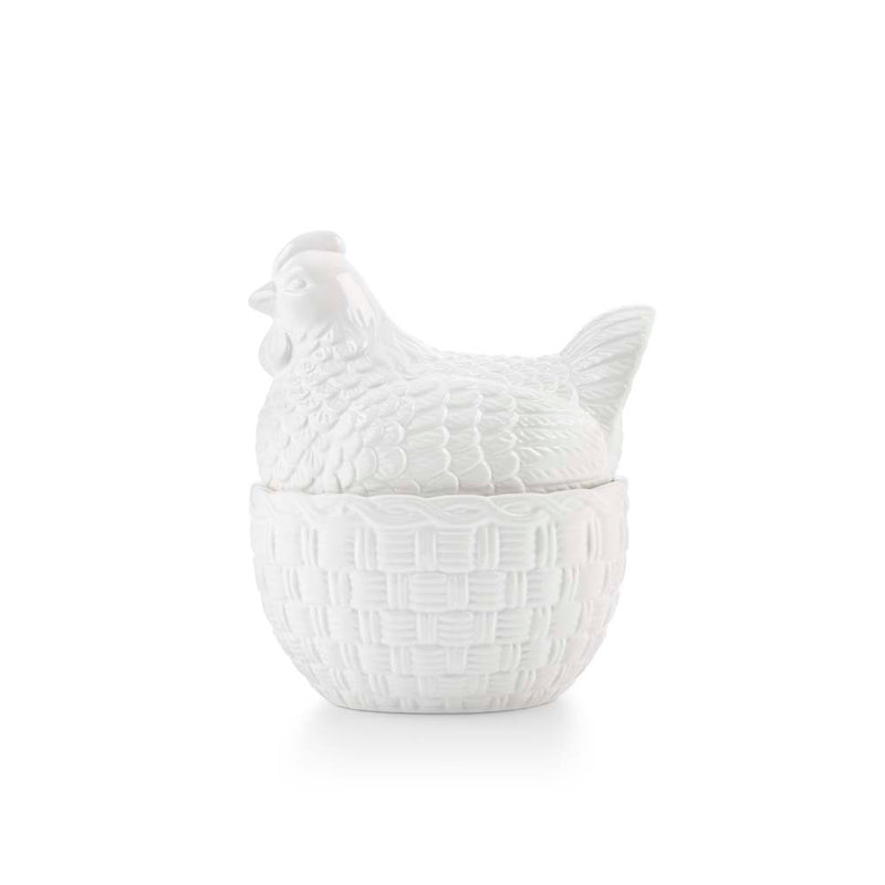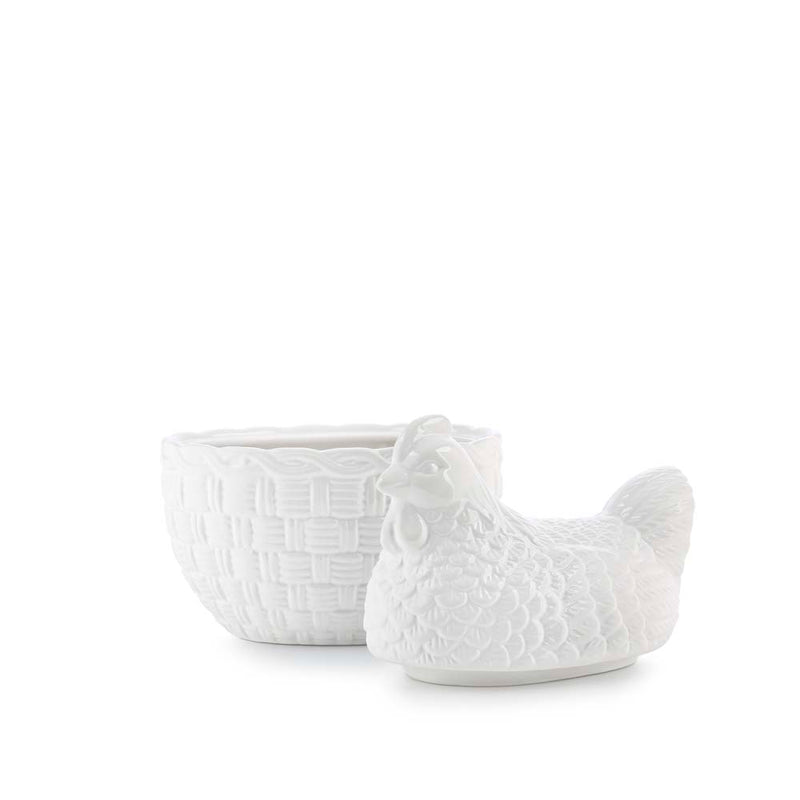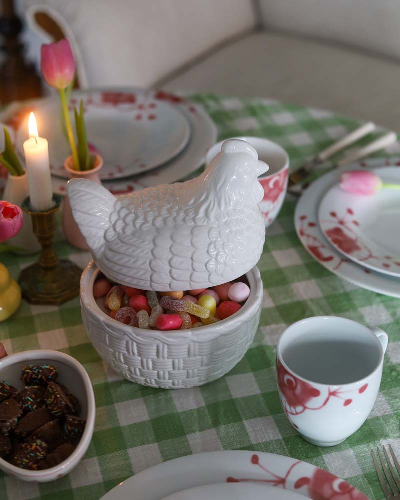Denne hvite porselenshønen med lokk har et rent og klassisk uttrykk. En nostalgisk påskedekorasjon som passer inn i enhver stil og skaper en rolig, elegant påskestemning.