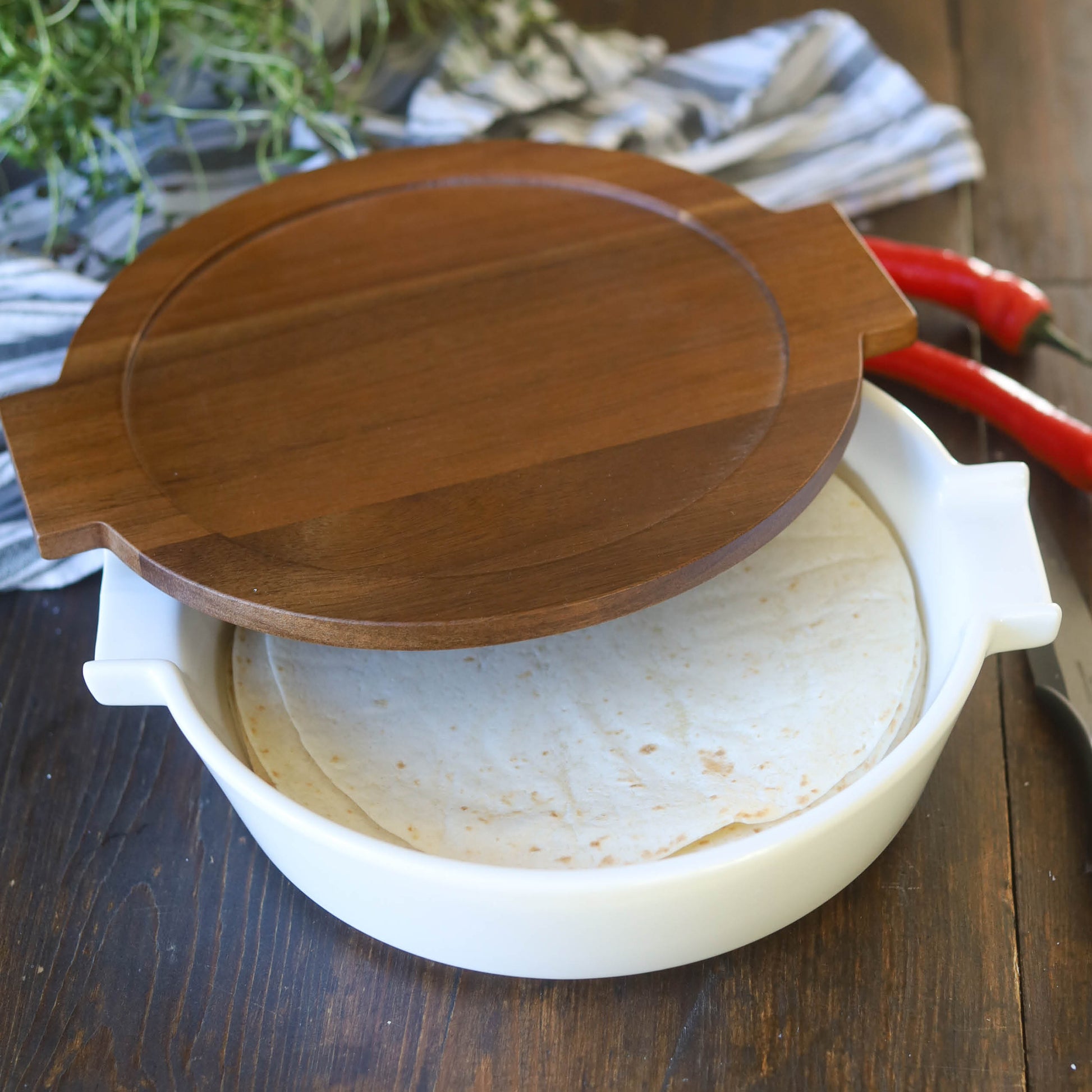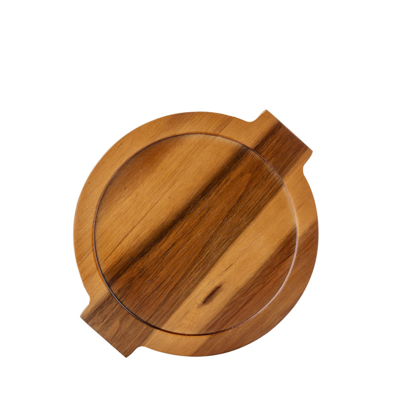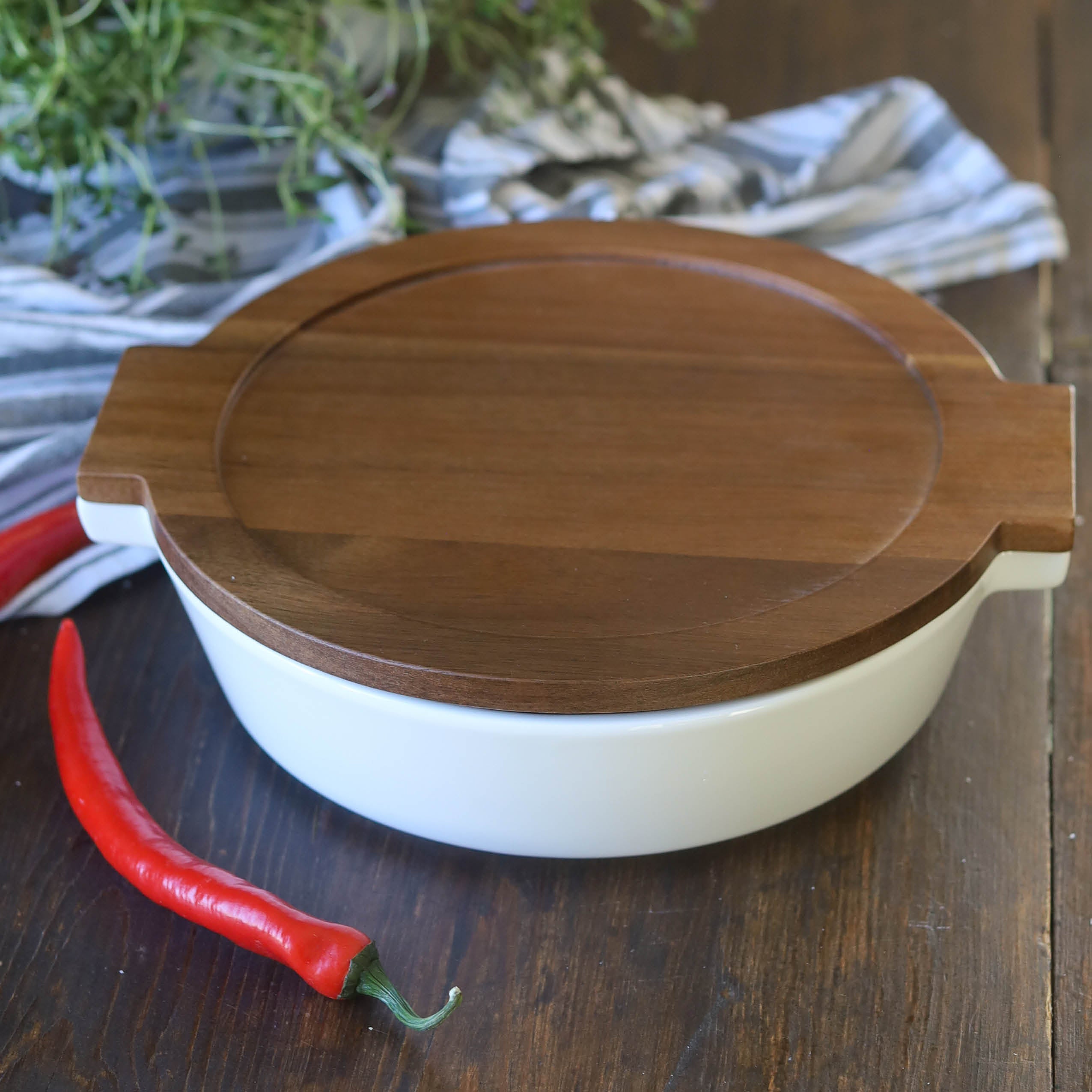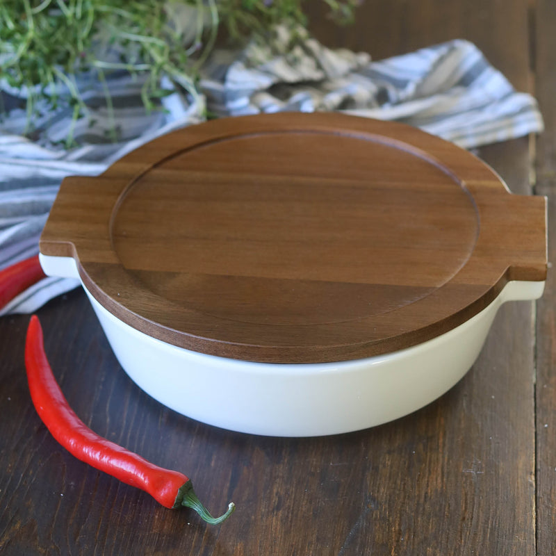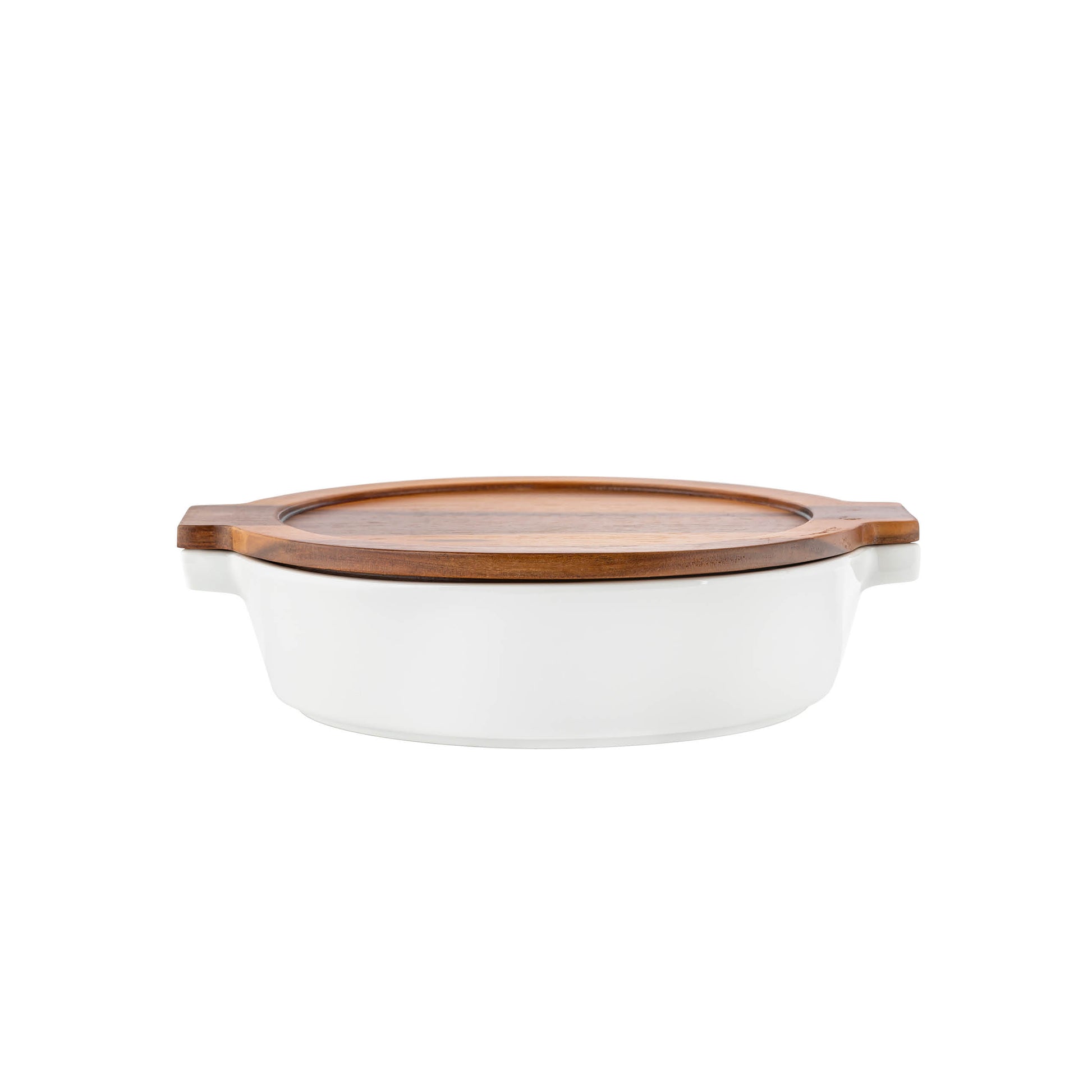 Den runde ildfaste bollen med lokk i akasietre er perfekt for retter som skal holdes varme. Lokket kan også brukes som en bordskåner eller et serveringsbrett, og tilfører et naturlig, varmt uttrykk til borddekkingen. Vær oppmerksom på at trelokket ikke skal brukes i ovnen.