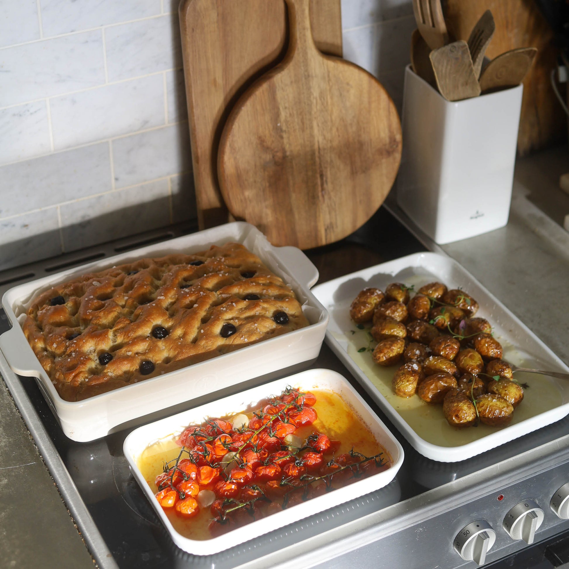 Det ildfaste fatet på 27 cm er et allsidig og elegant serveringsfat med lav kant, perfekt for både matlaging og servering. Bruk det til å varme opp brød, lune salater eller som et vakkert brett for småretter, tapas og desserter.