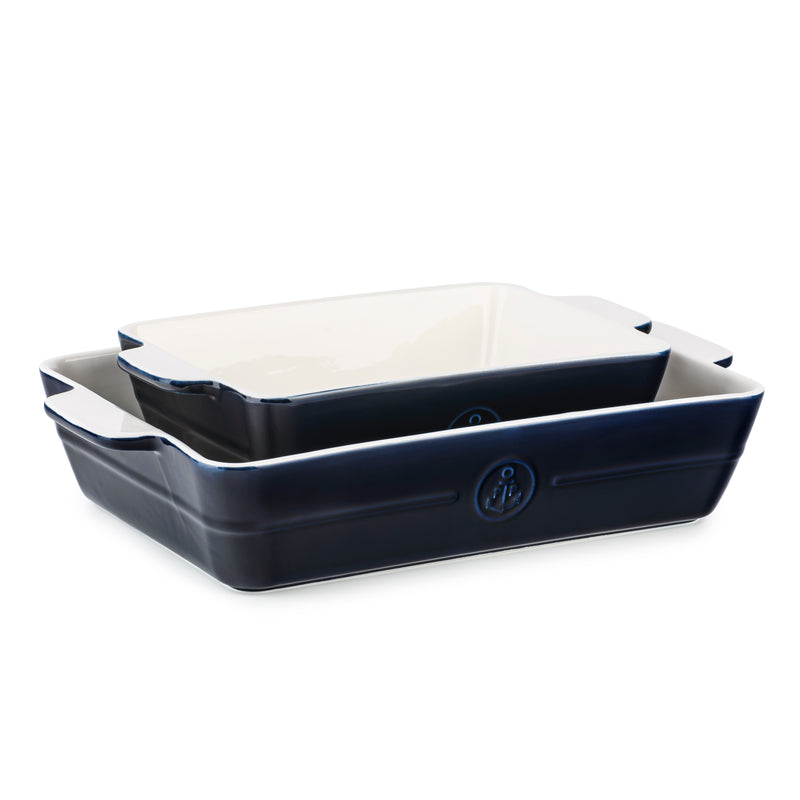 Dette elegante ildfaste settet i mørk blå feltspatporselen er ideelt for deg som ønsker et hint av maritim sjarm på kjøkkenet. Med to romslige former i ulike størrelser (32,5 x 20,5 cm og 23 x 19,4 cm) er dette settet perfekt til alt fra middagsretter til desserter. Den klassiske blåfargen gjør settet til en tidløs favoritt som passer like godt i moderne som tradisjonelle hjem. Det er et elegant og praktisk valg som løfter matlagingen og serveringen, uansett stil eller sesong.