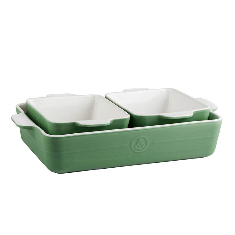 Ildfast sett fra Porsgrunds Porselænsfabrik består av én stor form på 37 cm (indre mål 33 x 32 cm) og to mindre former på 20 cm (indre mål 16 x 15 cm), samme størrelse som vi selger enkeltvis. Alle formene i settet kommer i en vakker grønn farge.
