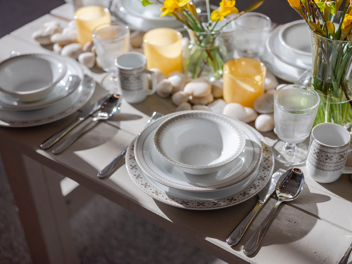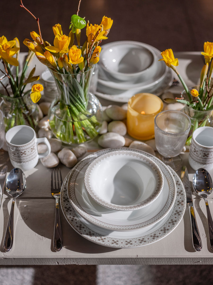 Her har vi satt sammen en servisepakke til fire personer, i nedtonet gråtoner.