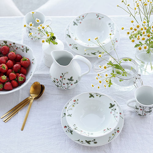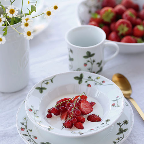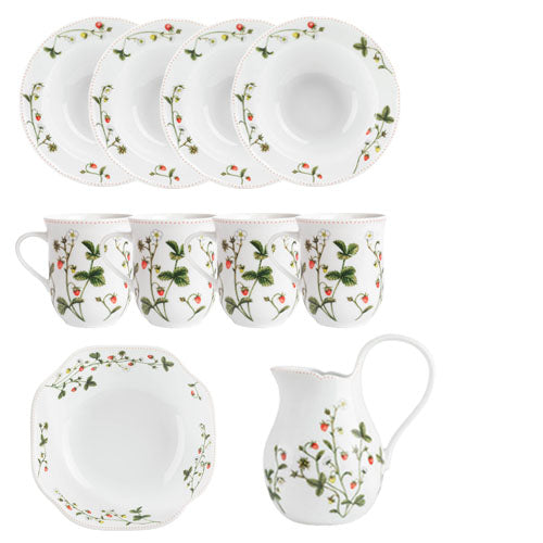 Med denne servisepakken kan du dekke bordet til 4 personer med det flotte serviset Jordbæreng.I denne pakken får du mugge, krus, dessertskåler og jordbærbolle.