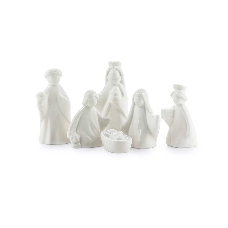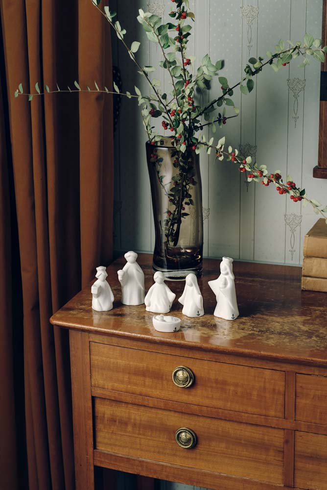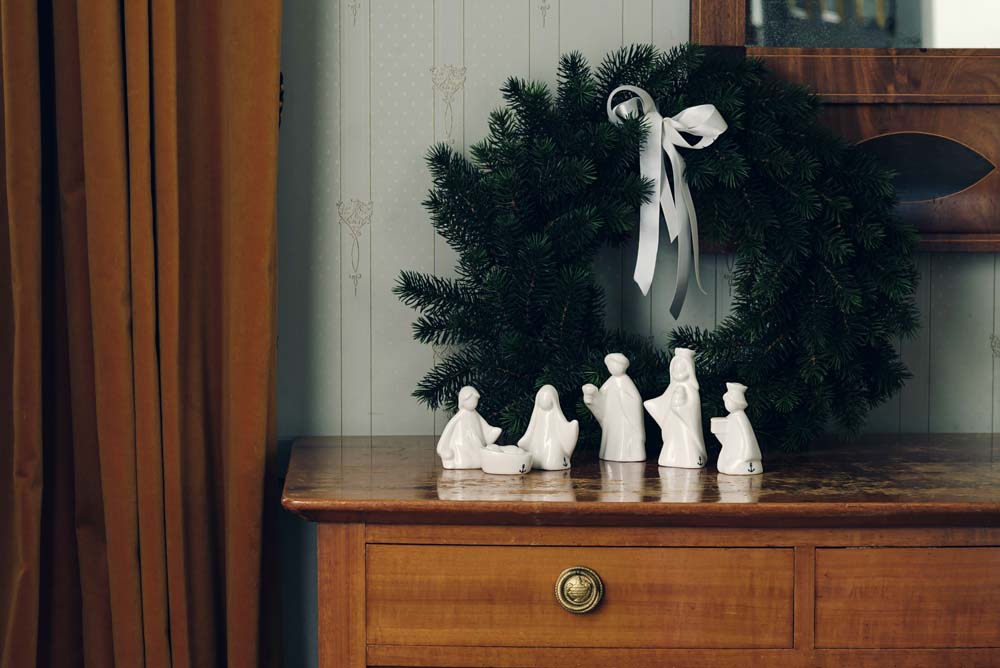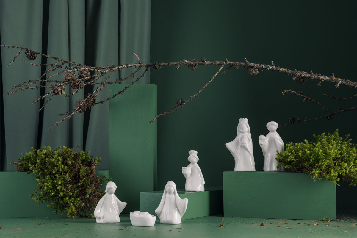 En vakker julekrybbe i hvitt porselen, med seks klassiske figurer. Minimalistisk, men full av tradisjon og høytidsstemning – et tidløst samleobjekt for julen.