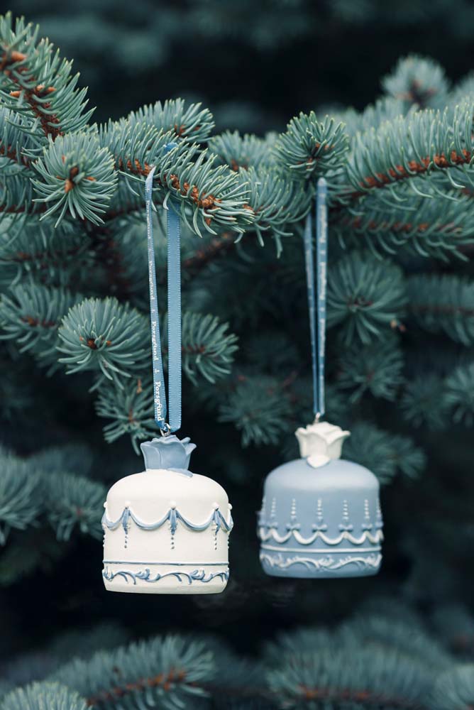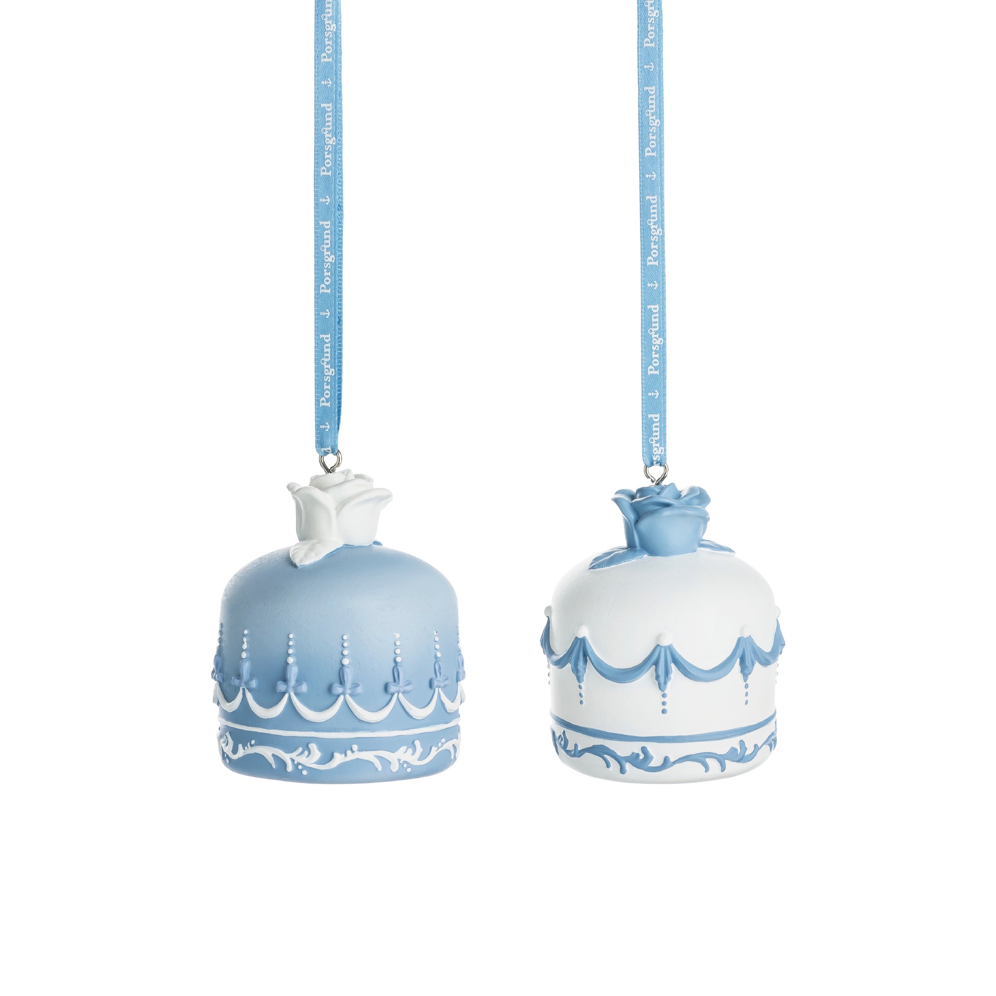 Små kaker i blå og hvite nyanser med elegante detaljer. Disse ornamentene gir et nostalgisk preg og passer perfekt på juletreet eller i en dekorativ oppstilling.
