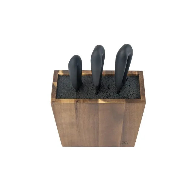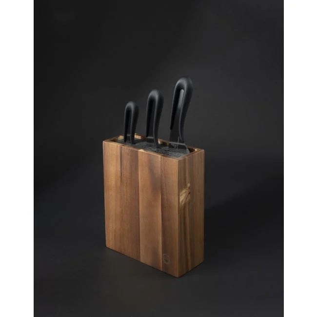 Knivblokken har et klassisk og enkelt design. Passer inn i alle type kjøkken. Knivblokken er laget i bærekraftig Acasiatre. Kniver står stødig og kan settes i flere posisjoner i plaststråene. Stråinnlegget kan tas ut for rengjøring. Knivblokken rengjøres med en fuktig klut.