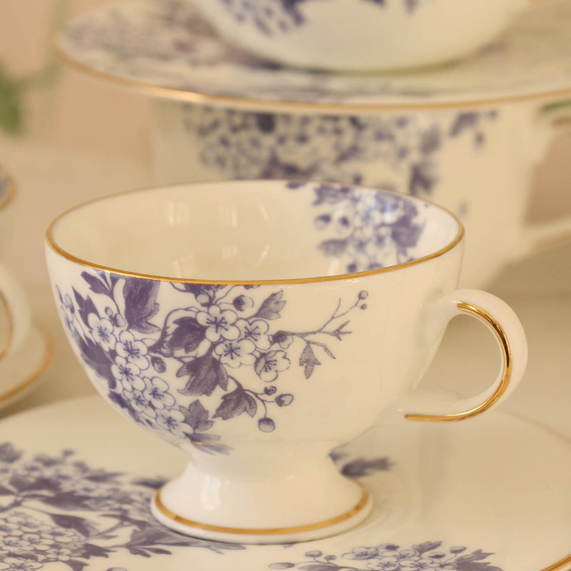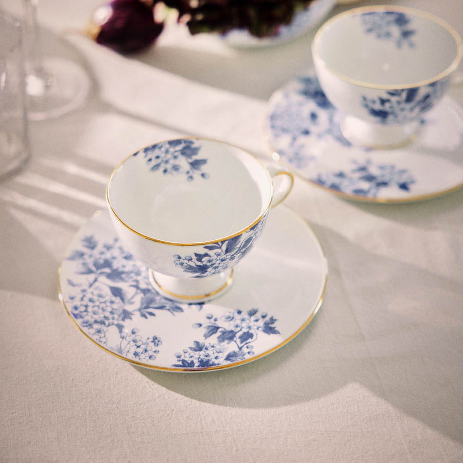 Denne blå kaffekoppen og skålen på 20 cl fra Porsgrunds Porselænsfabrik x byTiMo-kolleksjonen kombinerer vintage-inspirert design med en moderne, minimalistisk skål. Koppen har en diameter på 90 mm og den håndmalte gullkanten gir et luksuriøst preg. Skålen, med en diameter på 153 mm, er designet for å passe perfekt under koppen, og gir en elegant helhet til kaffestunden. Enten du nyter en rask morgenkaffe eller en koselig pause i godstolen, er denne koppen perfekt for de små, men viktige øyeblikkene i hverdagen.
