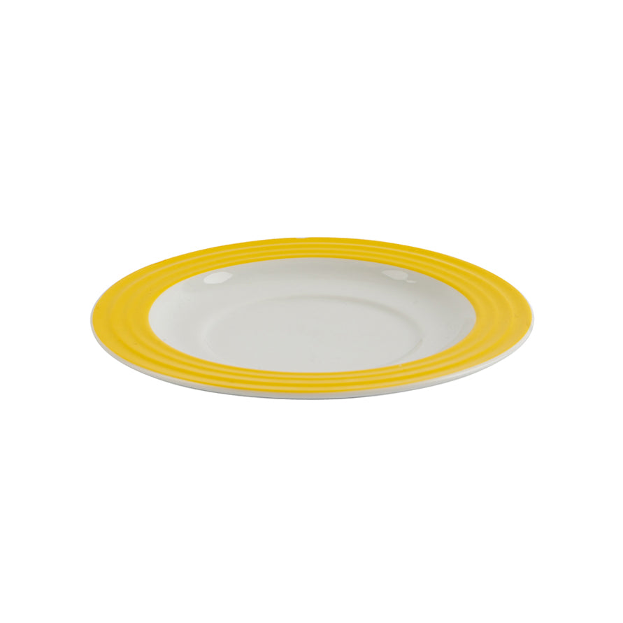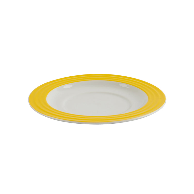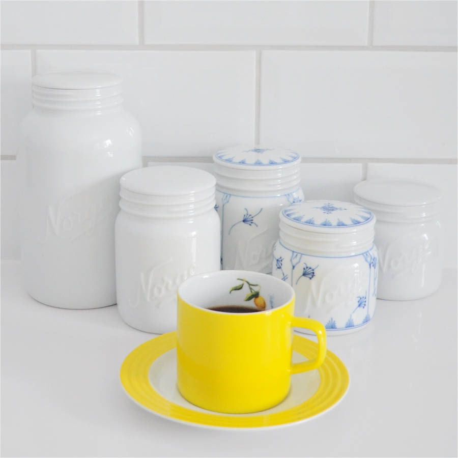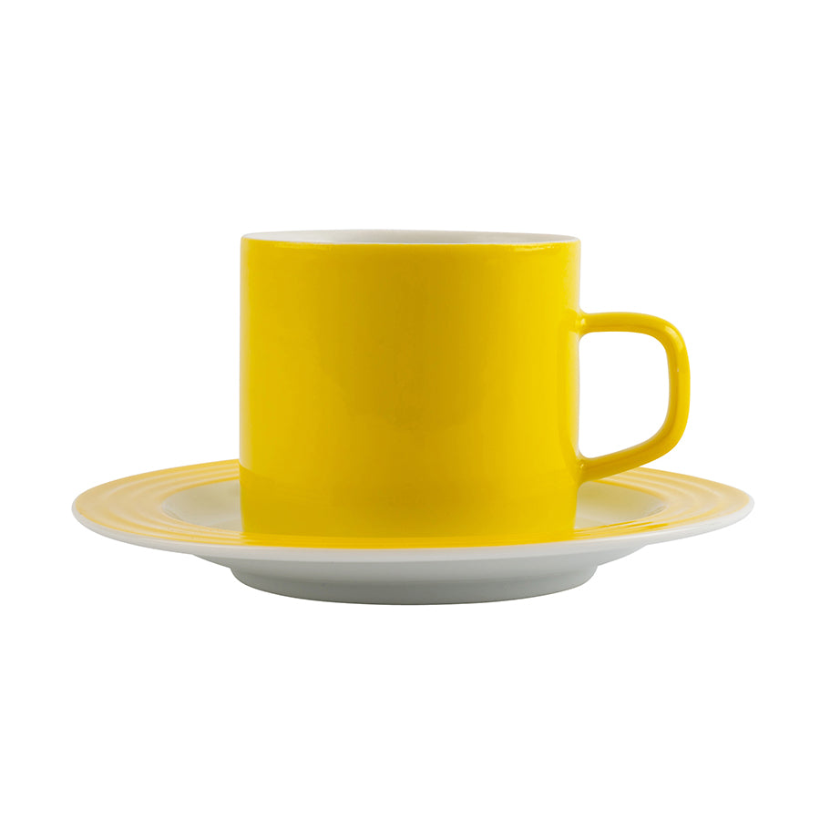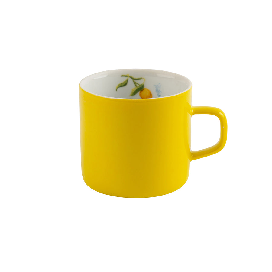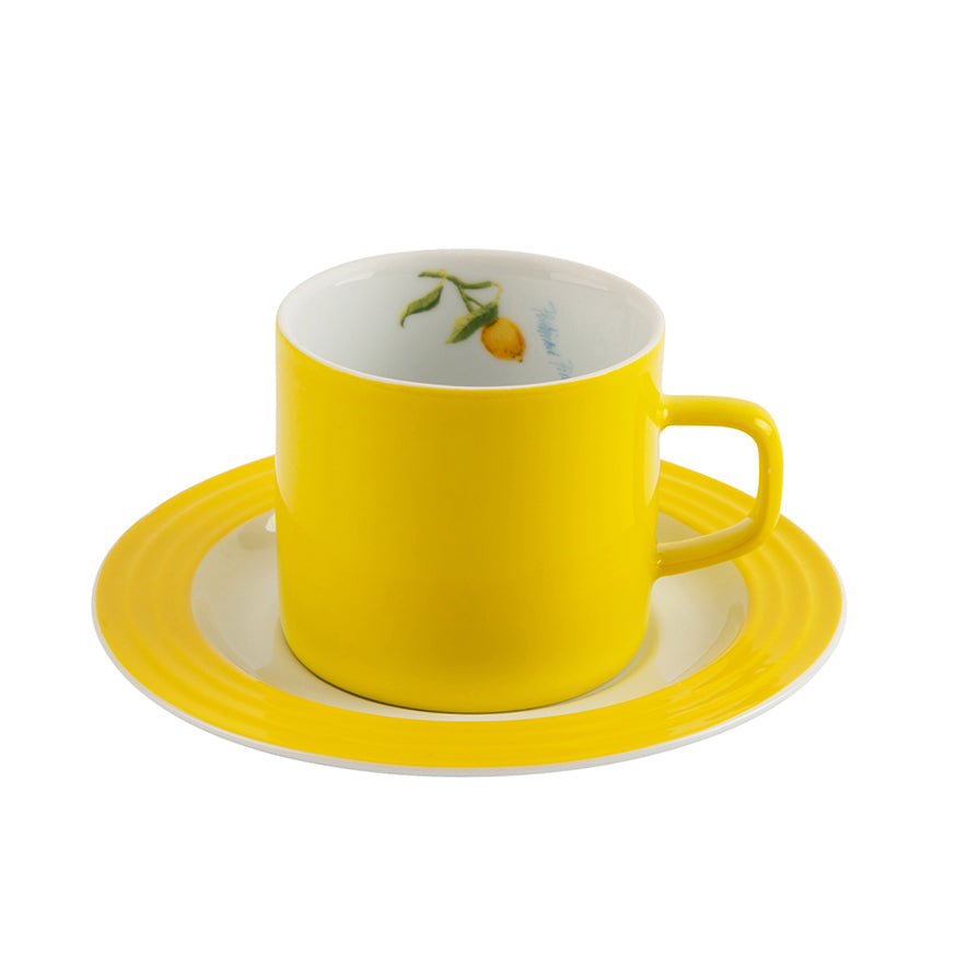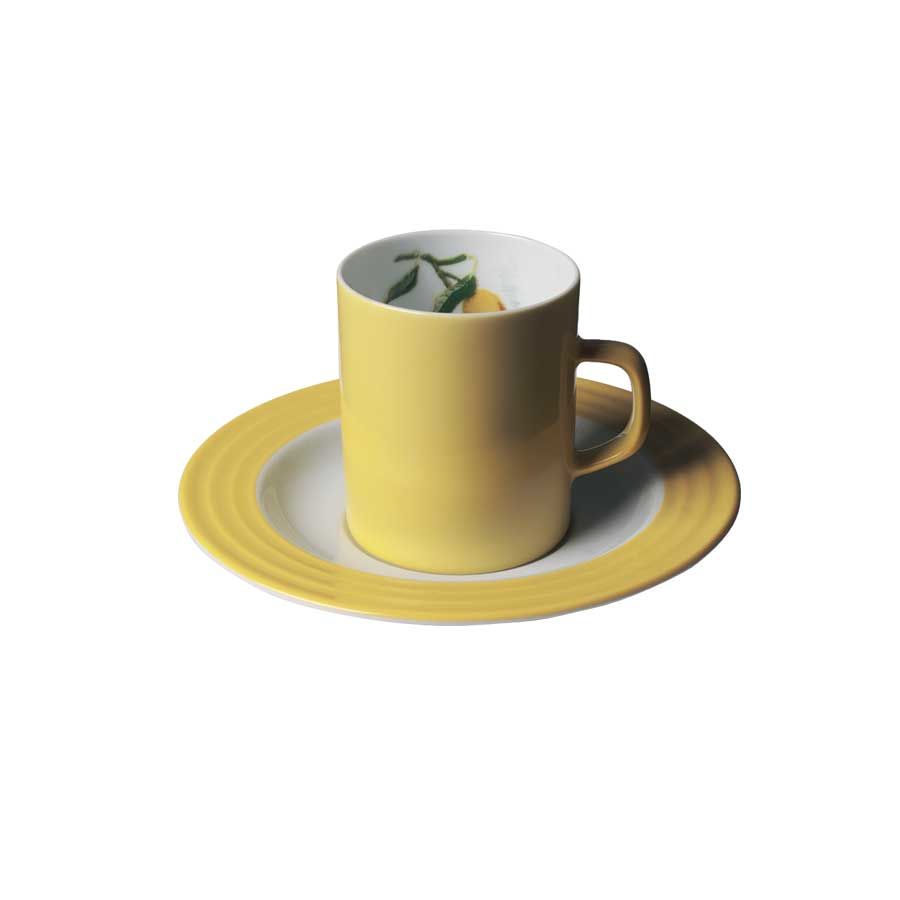 En elegant kopp for kaffe, te eller kakao. Koppen har en varm gul utside, mens innsiden er dekorert med en sitrongren med sitron. Den tilhørende skålen er en kombinasjon av gult og hvitt. Denne 23 cl koppen er bredere enn 15 cl-versjonen, og gir en mer romslig drikkeopplevelse. For et komplett servise kan den kombineres med asjett 21 cm og de mindre koppene i serien.