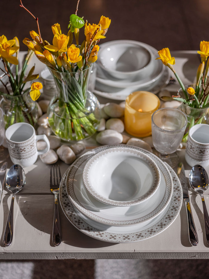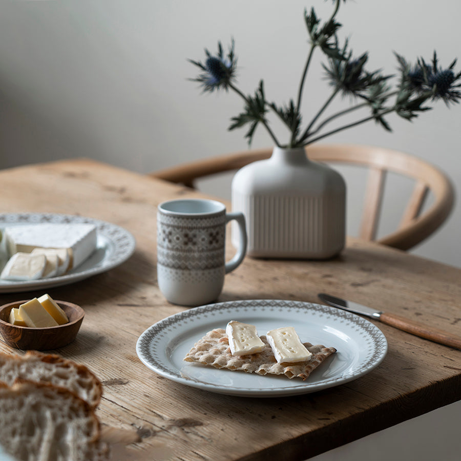 Da Porsgrund Porselænsfabrik ønsket sitt eget strikkemønster var det naturlig å hente inspirasjon lokalt. Derfor ble farger og mønster inspirert av skjortebroderier fra Øst-Telemarksbunaden. Kombinasjonen av strikk, bunad og porselen går opp i en høyere enhet og vi håper dette kan være en hyllest til norsk håndverk. Fargene er en klar referanse til bunadsuniverset, i tillegg til et nedtonet servise i gråtoner kommer også krus i spennende fargekombinasjoner. Med dette serviser håper vi også å kunne bidra til strikkeglede gjennom oppskrifter til plagg med samme mønster.