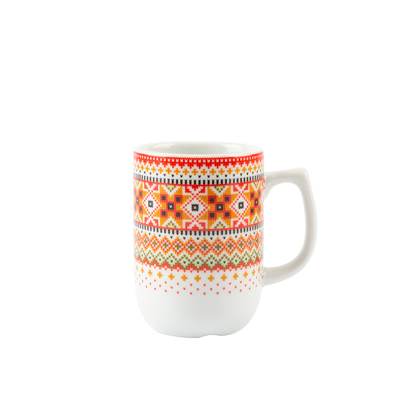 Krus 18 cl original. Da Porsgrund Porselænsfabrik ønsket sitt eget strikkemønster var det naturlig å hente inspirasjon lokalt. Derfor ble farger og mønster inspirert av skjortebroderier fra Øst-Telemarksbunaden. Kombinasjonen av strikk, bunad og porselen går opp i en høyere enhet og vi håper dette kan være en hyllest til norsk håndverk. Fargene i serviset er en klar referanse til bunadsuniverset, og kommer i nedtonet gråtoner eller spennende fargekombinasjoner. Med dette serviser håper vi også å kunne bidra til strikkeglede gjennom oppskrifter til plagg med samme mønster.