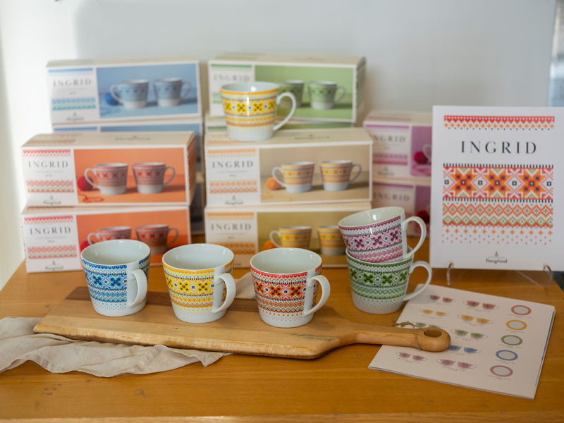 Fargene er en klar referanse til bunadsuniverset, i tillegg til et nedtonet servise i gråtoner kommer også krus i spennende fargekombinasjoner. Med dette serviser håper vi også å kunne bidra til strikkeglede gjennom oppskrifter til plagg med samme mønster.