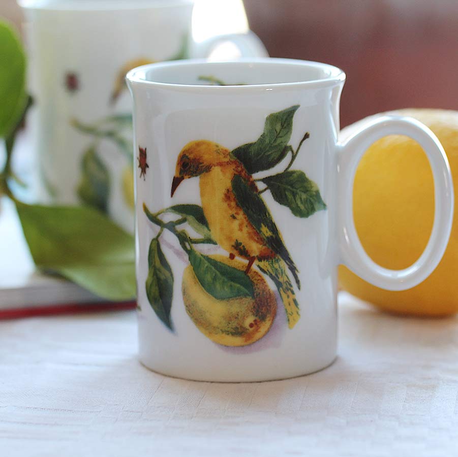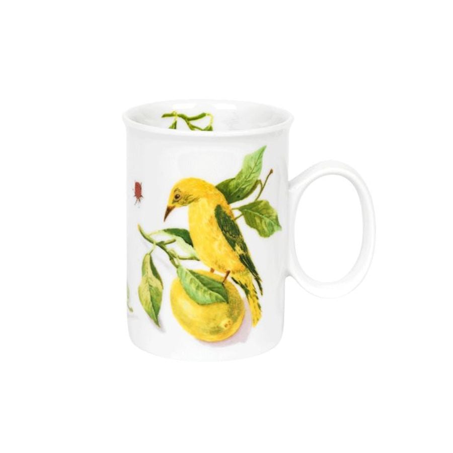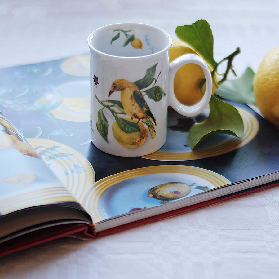 Et sjarmerende krus med et unikt motiv av en gul fugl som hviler på en sitrongren omgitt av blader og sitroner. Saturn-designet gir en klassisk følelse, mens det friske sitronmønsteret tilfører en livlig sommerstemning. Perfekt for kaffe, te eller andre varme drikker. Kombiner det med asjett 21 cm for en komplett kaffestund, eller middagstallerken 27 cm for en gjennomført borddekking.