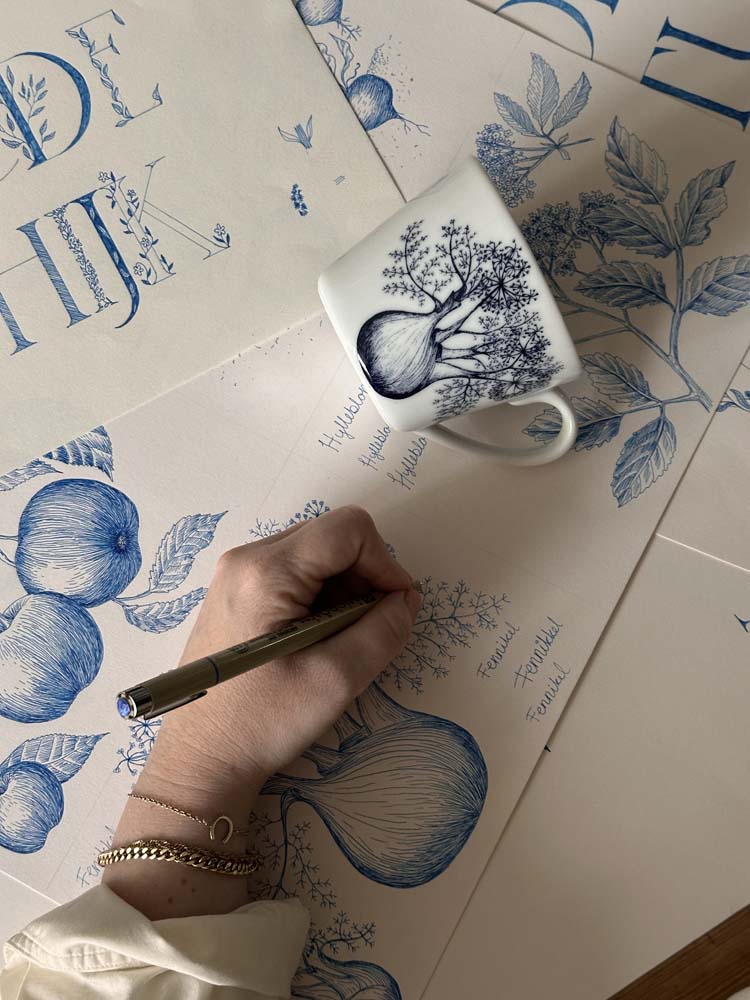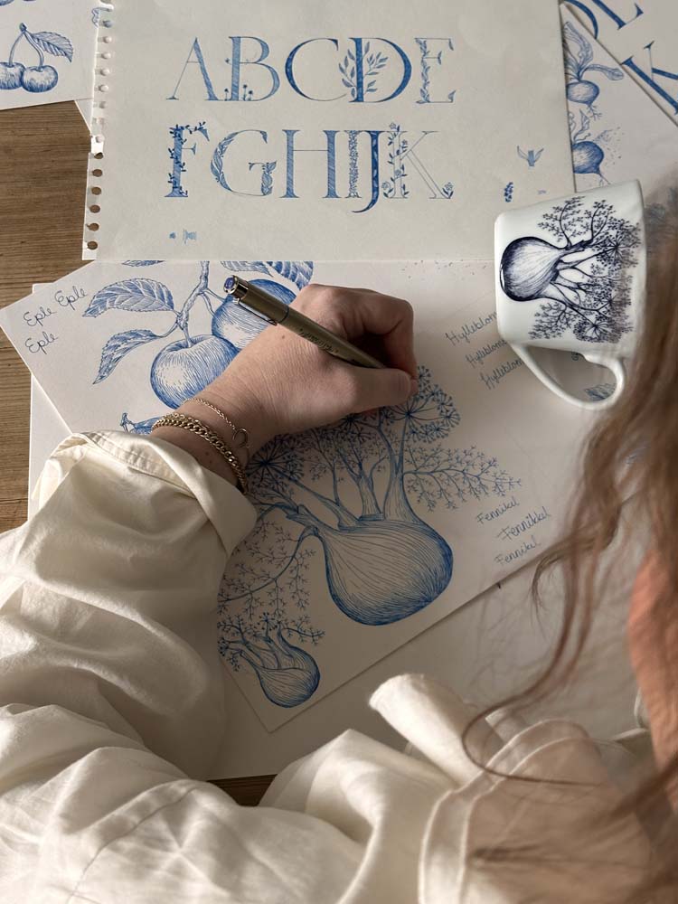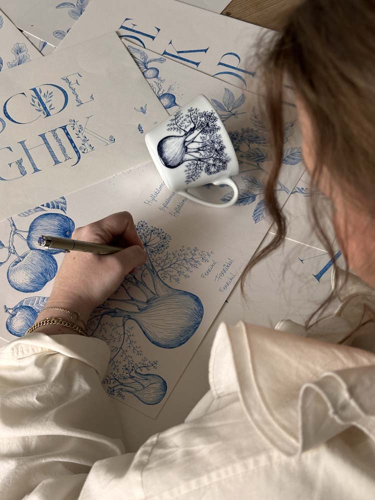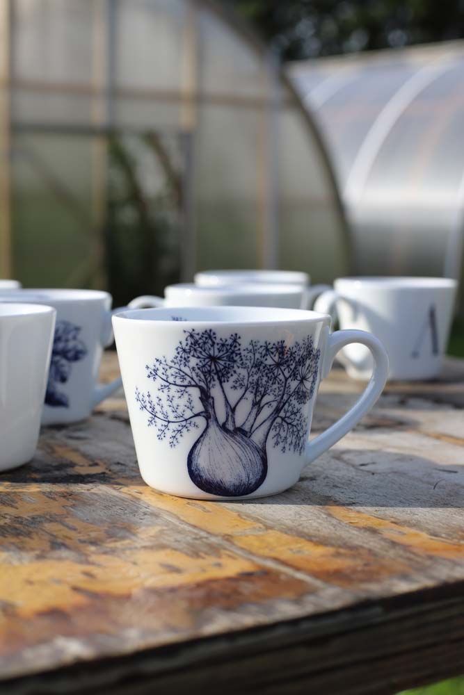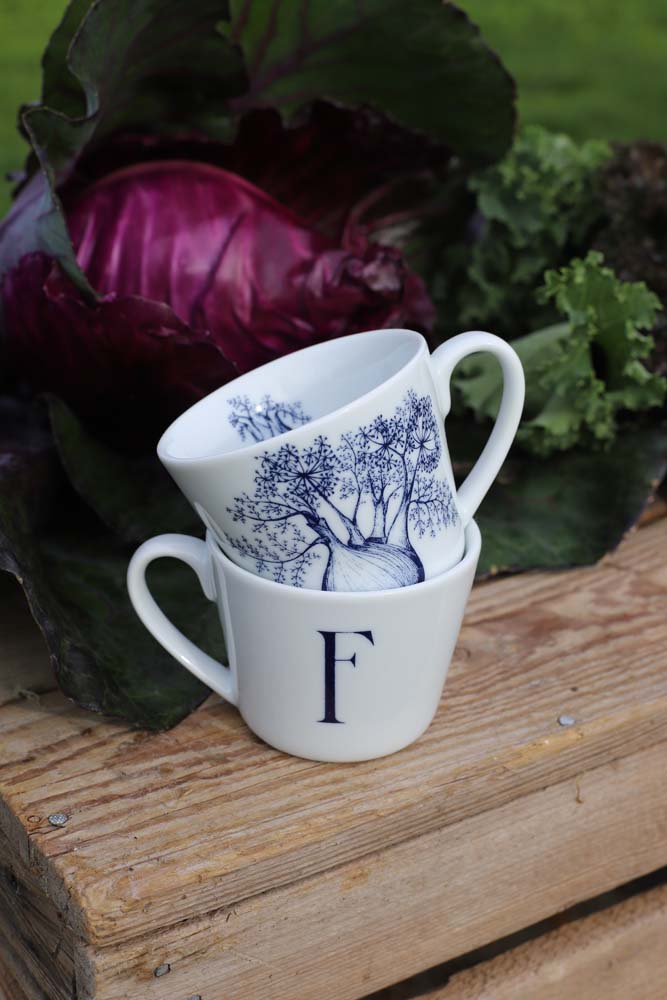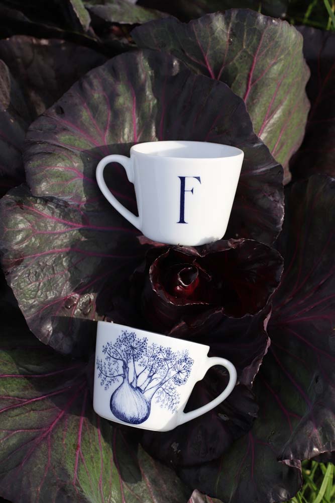 Bokstavkrus F har en elegant illustrasjon av fennikel på den ene siden, kjent for sine fine linjer og aromatiske uttrykk. Den håndtegnede streken gir kruset et botanisk og sofistikert preg. Det skjuler seg også en vakker illustrasjon på innsiden av kruset. Designer: Cathrine Kirkerud.