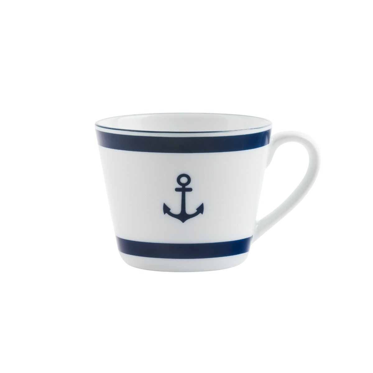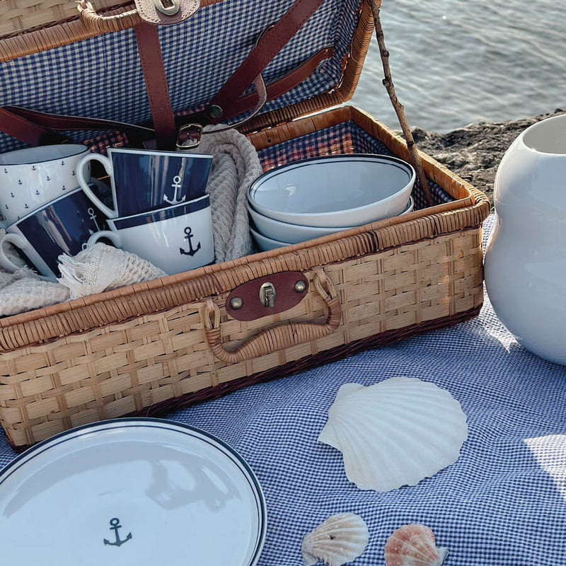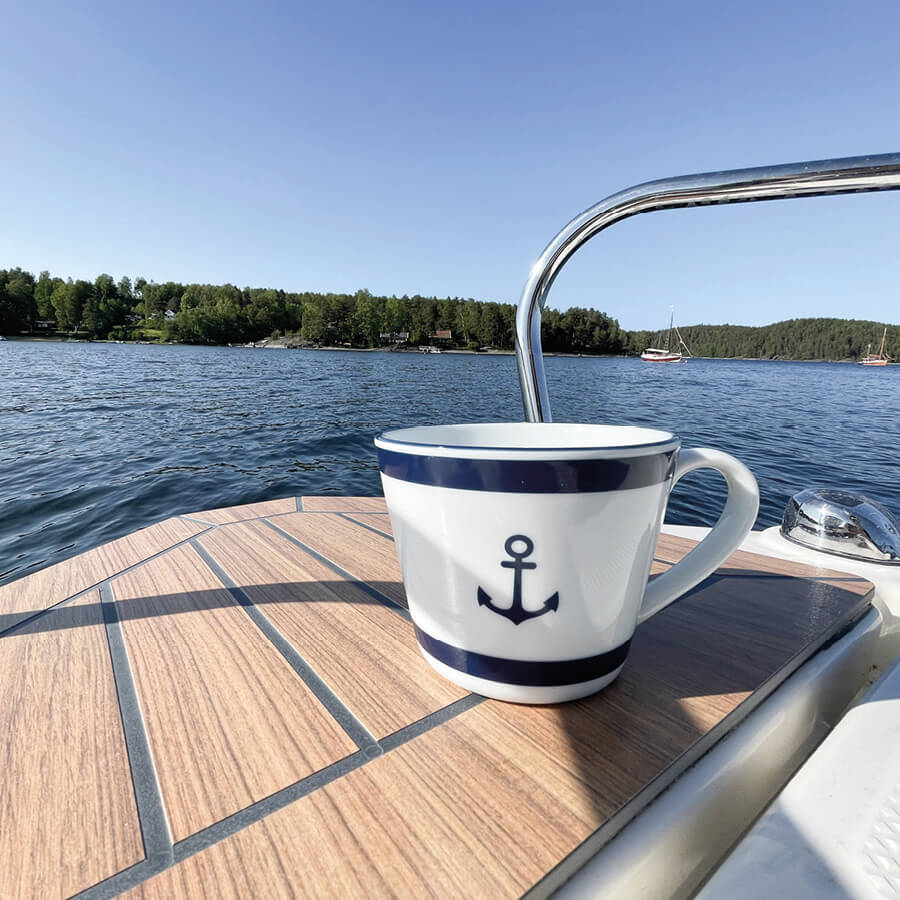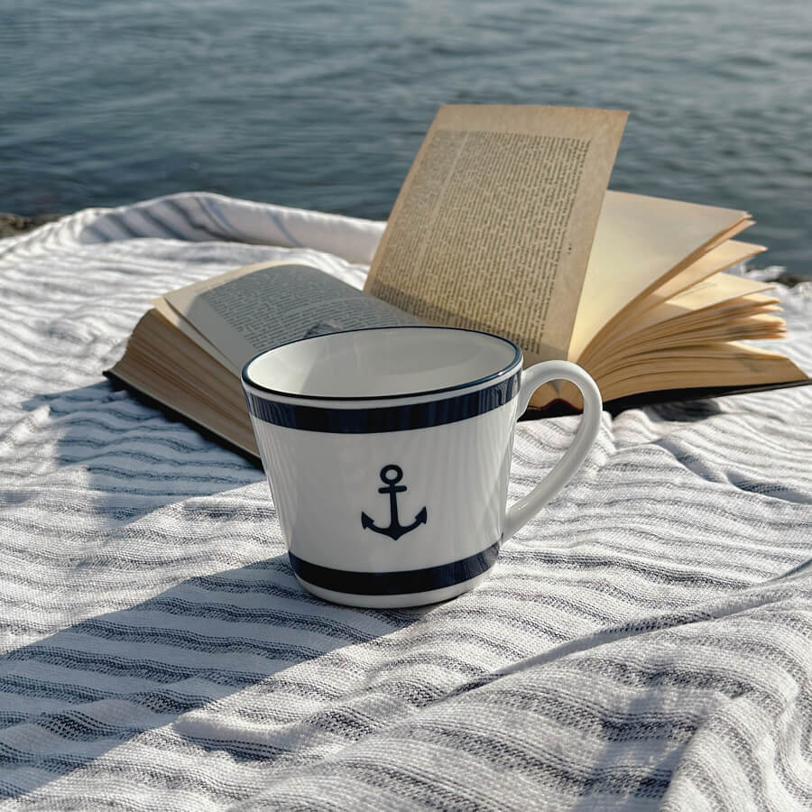 Sommerens perfekte servise, Maritim - en stilren serie i nautisk stil. Serviset er en hyllest til vår lange historie med nærhet til vann og sjø. Maritim føyer seg inn i vår lange tradisjon med blådekorerte serviser. I serviset møter moderne former og linjer det klassiske blå og maritime. Serviset har enkle og tidløse former som er designet for å passe til det meste. Dekoren med blå rand er delikat og lett og det ikoniske PP-ankeret setter prikken over i’en i senter av alle delene. Maritim er det perfekte serviset for deg som liker båtliv, har hytte ved sjøen eller som setter pris på den stilrene, maritime stilen. Med tilbehør som blå tekstiler, kork og treelementer er sommerstemningen sikret - uansett om det er på sommerhytta, hjemme, i båten eller på bryggekanten. Serviset består av to tallerkener, to boller og seks krus. Krusene fordeler seg på to typer krus med tre ulike dekorer.