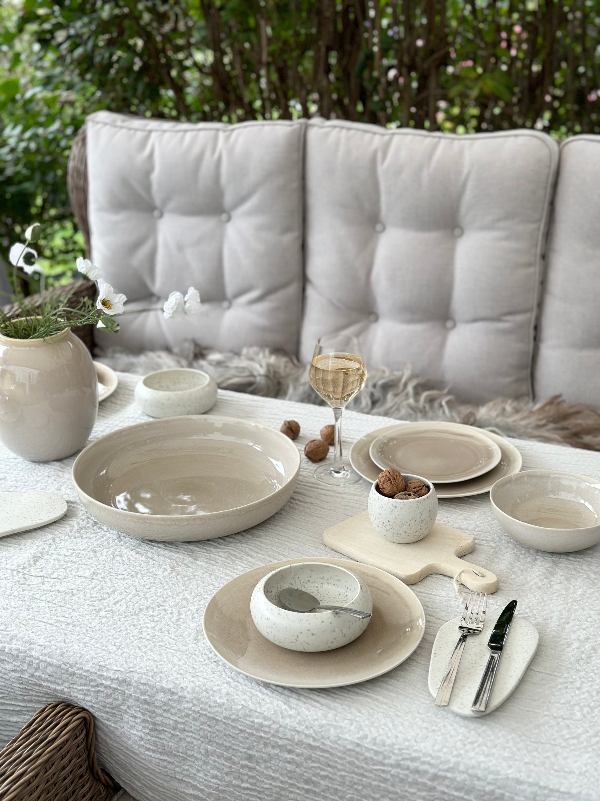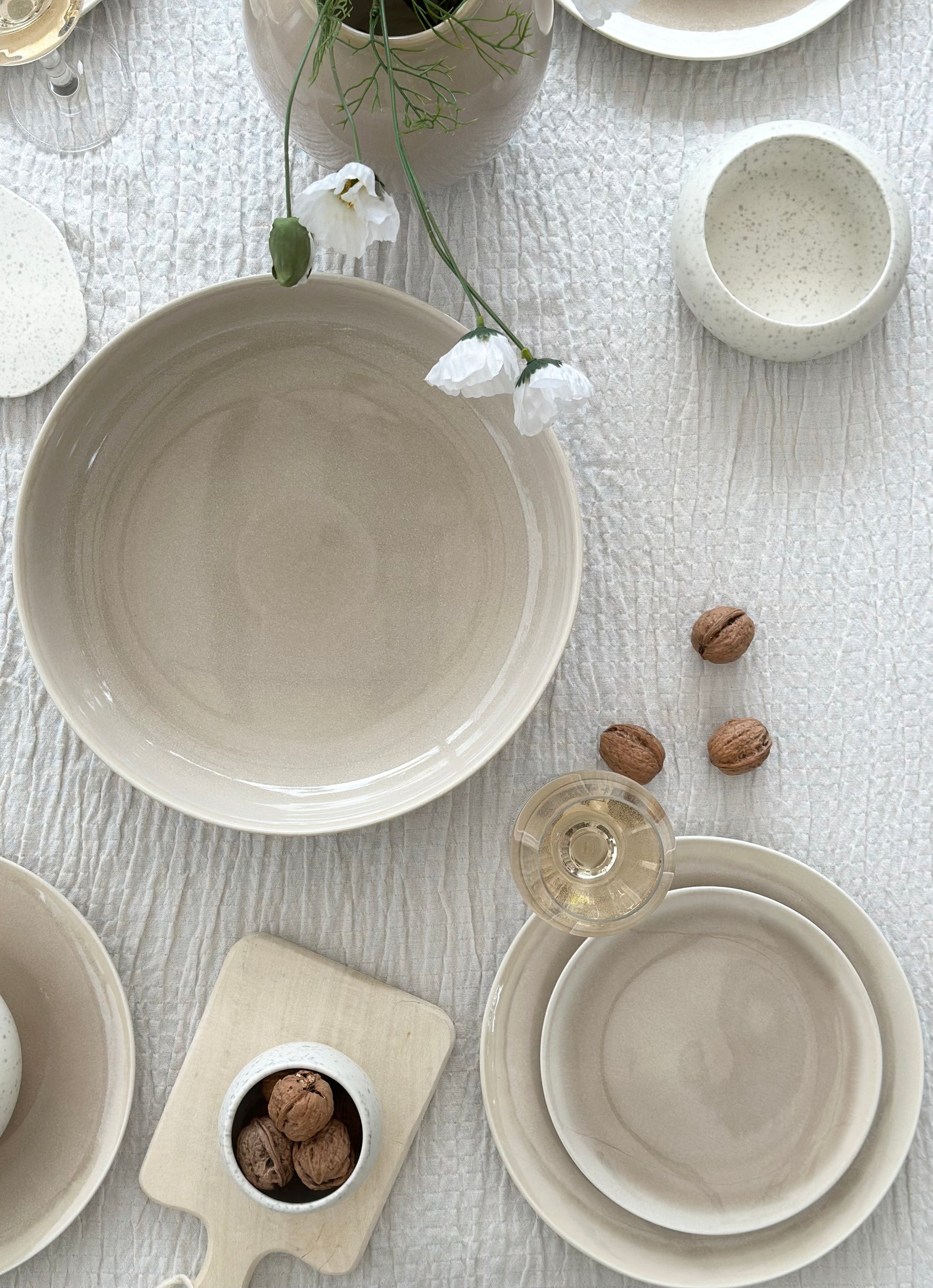 Ellie-serien kombinerer tidløse pastellfarger med reaktiv glasur, som gir hver del unike variasjoner og en håndlaget følelse. Den lave bollen på 33 cm er både funksjonell og dekorativ, og passer perfekt til alle anledninger, fra hverdagsbruk til fest.