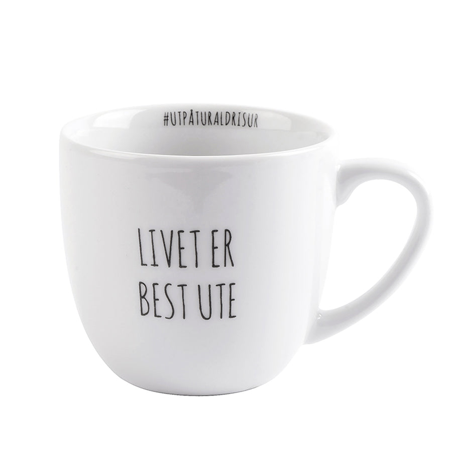 Kruset rommer 38 cl, og har en stor hank som er god å holde i. På forsiden av kruset står det "Livet er best ute", og på baksiden er det illustrajon av et telt i naturen. Nyt kaffe, te eller kakao fra det nye hashtagkruset ditt! #utpåturaldrisur