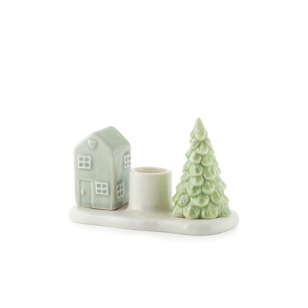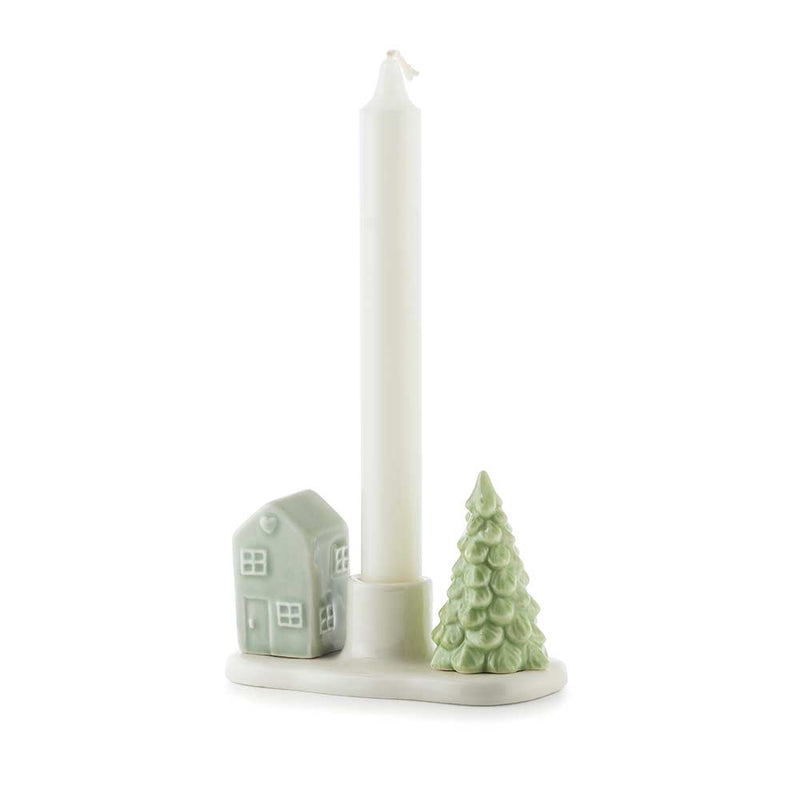 En lysestake med små hus og juletre i porselen – en miniatyr av vinterstemning som skaper hygge i vinduskarmen eller på bordet.