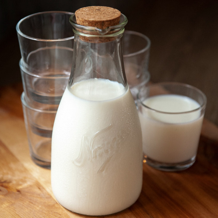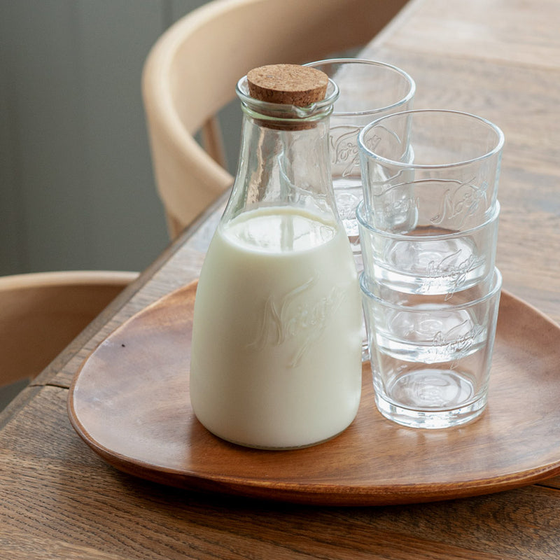 Denne melkemuggen er et vakkert og stilig tillegg til ethvert kjøkken. Den er laget av glass og har en naturlig trekork som lokk. Den er uten håndtak, noe som gjør den enkel å fylle og tømme. Den er perfekt for å lagre melk, juice eller andre drikker, men passer ikke for varme drikker. Den er også et flott dekorativt element som vil se fantastisk ut på kjøkkenbenken.