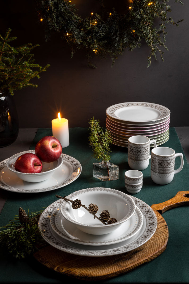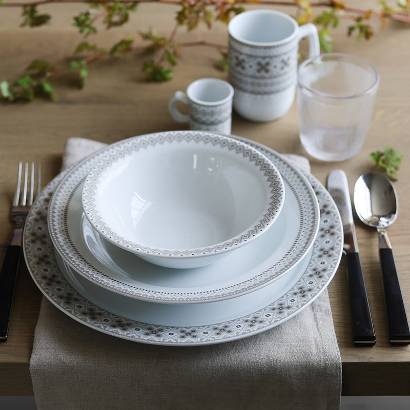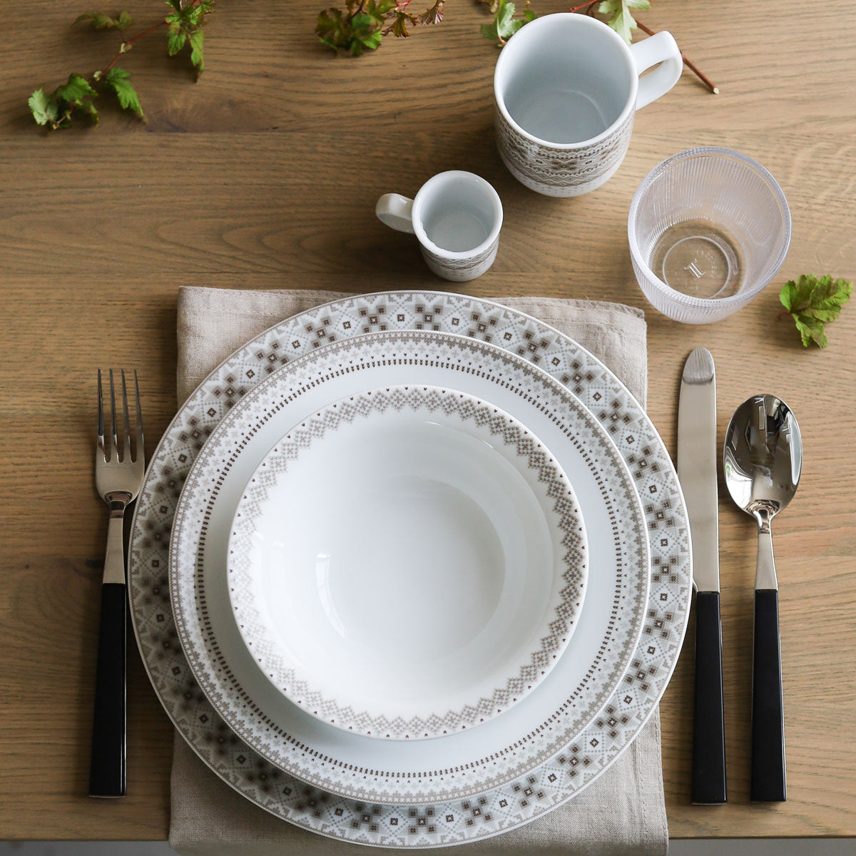 Ingrid middagstallerken 27 cm grå. Med serviset Ingrid går Porsgrunds Porselænsfabrik tilbake til røttene, og henter inspirasjon fra Øst-Telemarksbunaden. Mønsteret i dekoren på serviset, er moderniserte versjoner av broderier fra de over 150 år gamle bunadsskjortene. Da designer Cathrine Kirkerud utviklet dekoren til Ingrid-serviset, hentet hun inspirasjon lokalt. Med farger og mønster inspirert av skjortebroderier fra Øst-Telemarksbunaden blir dette en hyllest til norsk håndverk. Serien finner du i nedtonet og delikate gråtoner, samt i spennende fargekombinasjoner med tydelige referanser til bunadsuniverset.