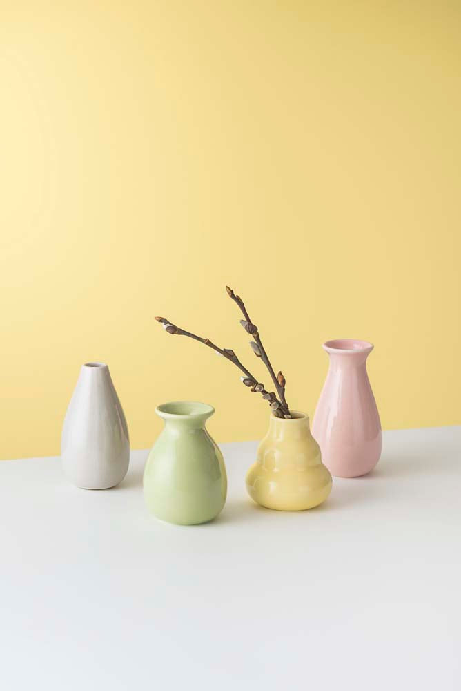 Sett med små porselensvaser som passer perfekt til vårblomster og små buketter. En fleksibel og dekorativ løsning som gir liv til bordet, hyllen eller vinduskarmen – også etter påske.