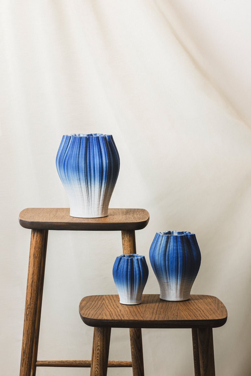 En mellomstor vase i Muriel-serien, skapt med inspirasjon fra havets bevegelser og korallrevets sarte skjønnhet. De bølgende linjene og den graderte glasuren gir et dynamisk, men rolig uttrykk. Vasen er laget i 3D printet porselen, noe som gjør det til en mer bærekraftig måte å produsere på, siden man kun bruker den porselensmassen som faktisk trengs for å skape produktet. Perfekt alene eller i kombinasjon med den andre størrelsen i serien.