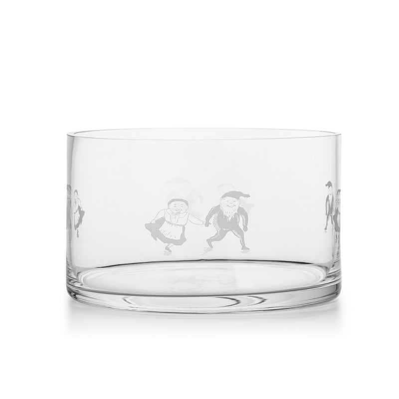 En romslig bolle i glass dekorert med sandblåste nisser. Ideell til frukt, nøtter, julesalat, eller riskremen og er et vakkert blikkfang på julebordet. Kombineres fint med resten av serien.