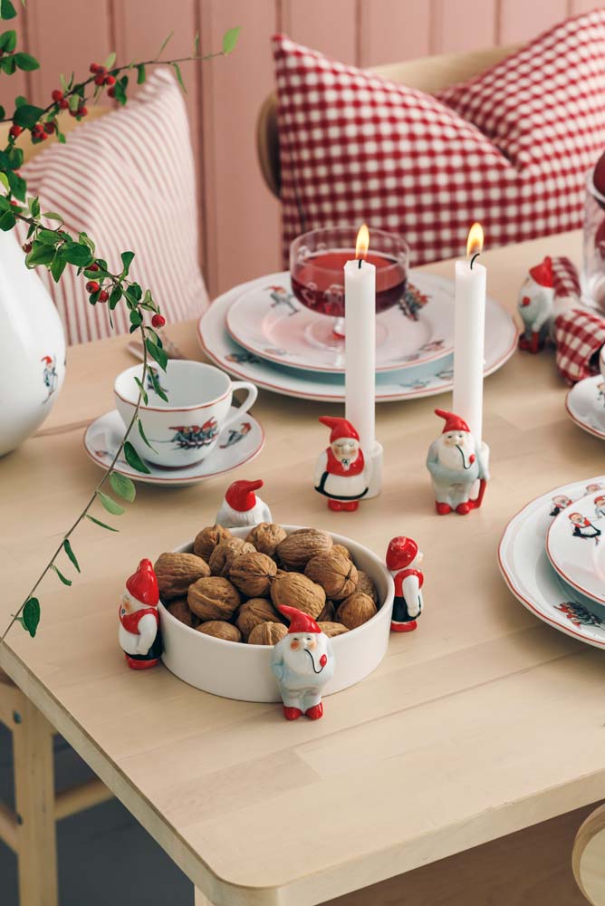 En stemningsfull porselensbolle dekorert med små nisser rundt kanten. Passer til servering av småretter, godis eller som koselig julepynt.