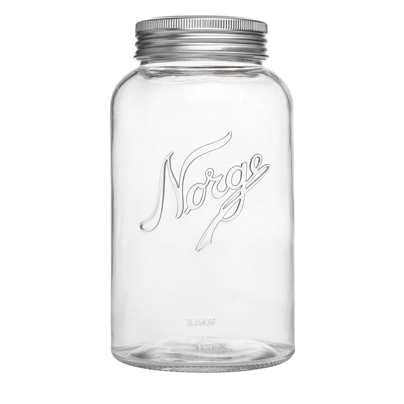Dette er Norgesglasset slik vi kjenner det. Tradisjonellt med skrulokk. Det kan brukes til sylting, hermetisering og oppbevaring av mat. Det er solid og praktisk og fint å bruke til dekorering. Dette store fine glasset rommer 2 liter.