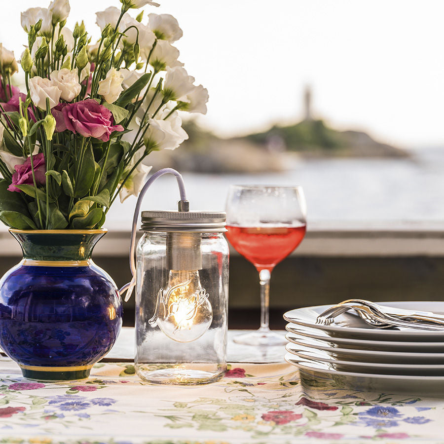 Det orginale Norgesglasset med 4 watt LED pære med lang levetid. Hvit tekstilledning på 2 meter med oppheng følger med. Lampen kan brukes ute, men den er ikke fukt sikker.