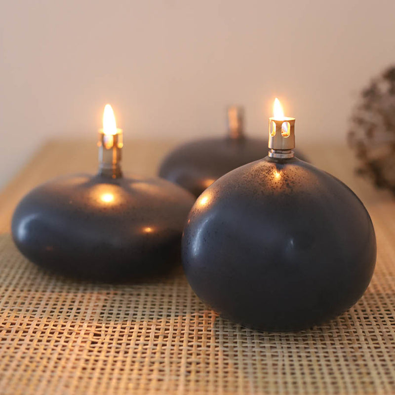 Rullestein, naturlig slipt og formet av vannets bevegelser gjennom tidene, er inspirasjonen bak disse oljelampene i porselen. Lampene gir et stemningsfullt lys og skaper en hyggelig atmosfære i alle rom. Brenneren er laget av stål med en glassfiberveke, og lampene er CE-godkjente.