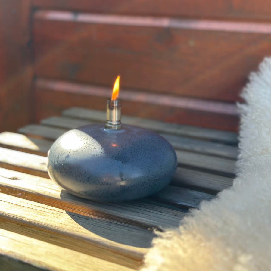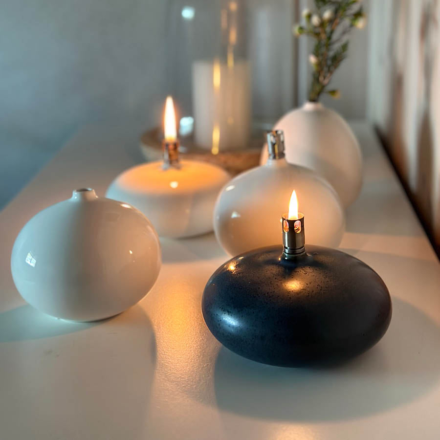 Rullestein, naturlig slipt og formet av vannets bevegelser gjennom tidene, er inspirasjonen bak disse oljelampene i porselen. Lampene gir et stemningsfullt lys og skaper en hyggelig atmosfære i alle rom. Brenneren er laget av stål med en glassfiberveke, og lampene er CE-godkjente.