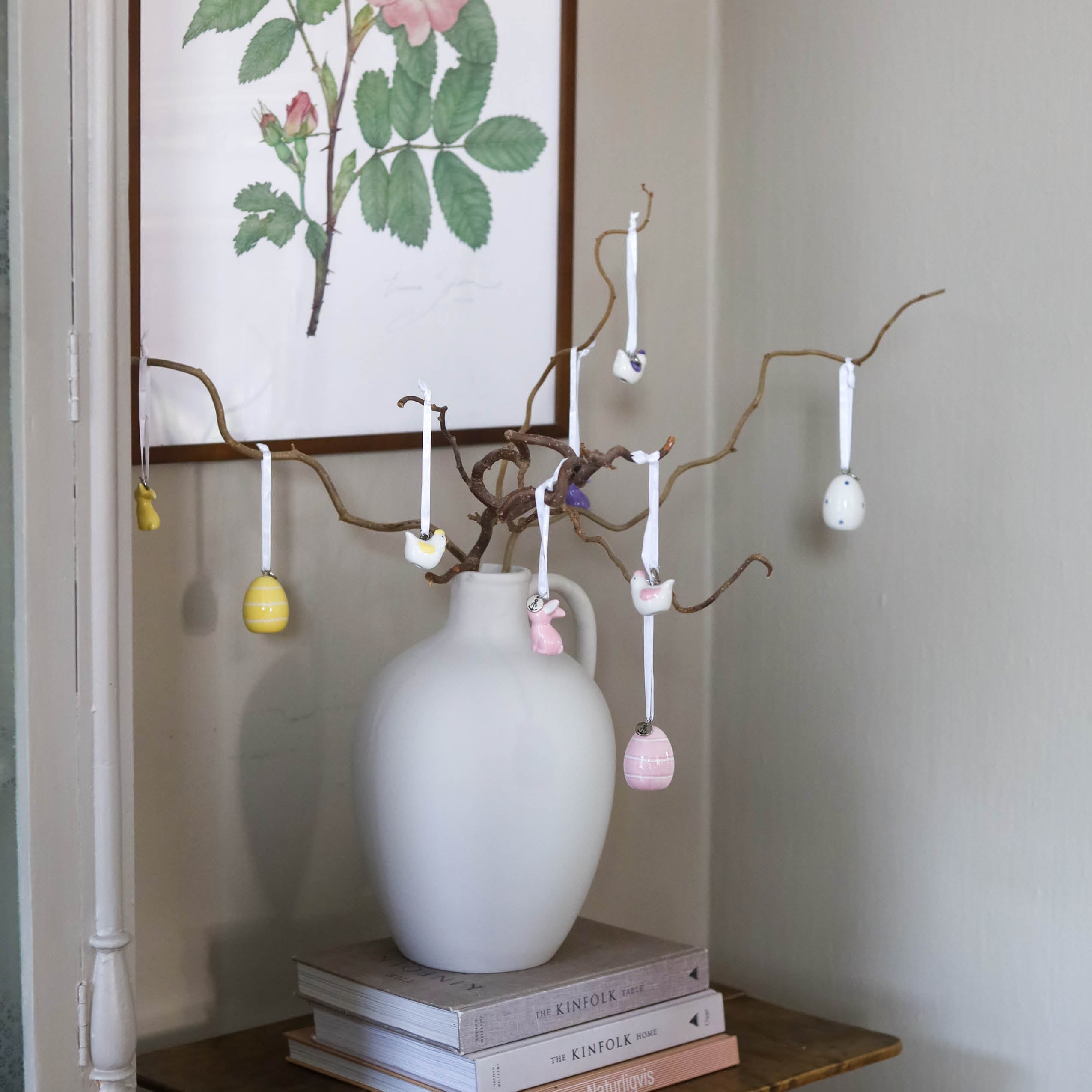 3-pakning med tre søte hengepynt i porselen: en hare, et egg og en høne i gule og hvite nyanser. Denne nydelige påskepynten er perfekt for å dekorere påskebordet, pynte opp en kuvert, eller henge på vrihassel eller dekorative gåsunger. De delikate detaljene og de myke fargene skaper en koselig og innbydende stemning til påskefeiringen.