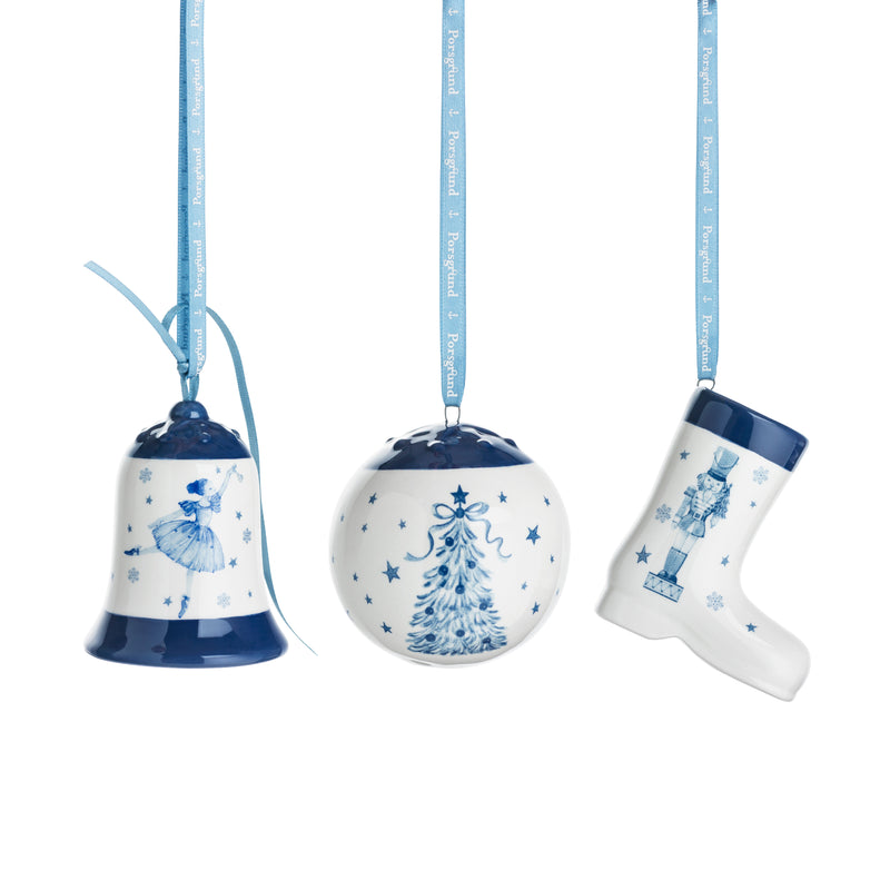 Et stemningsfullt sett med tre ulike ornamenter i blå ballerina-design. Nydelig som helhet eller spredd rundt på juletreet.