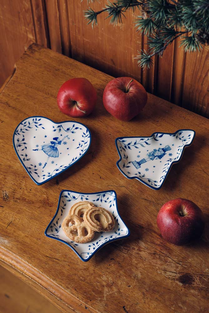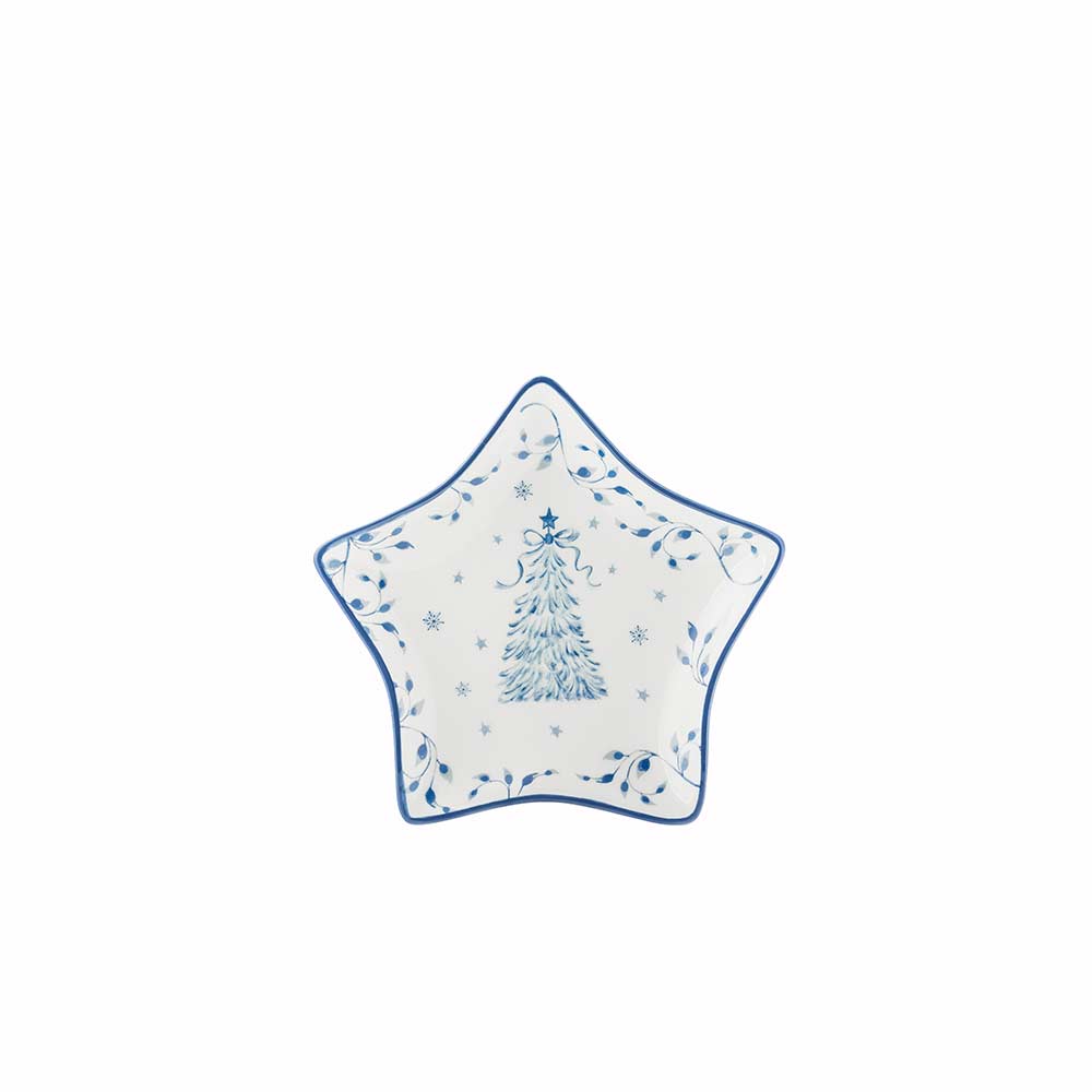 En liten serveringsskål formet som en stjerne, dekorert i blå ballerina-mønster. Perfekt til julegodt eller som pynt.