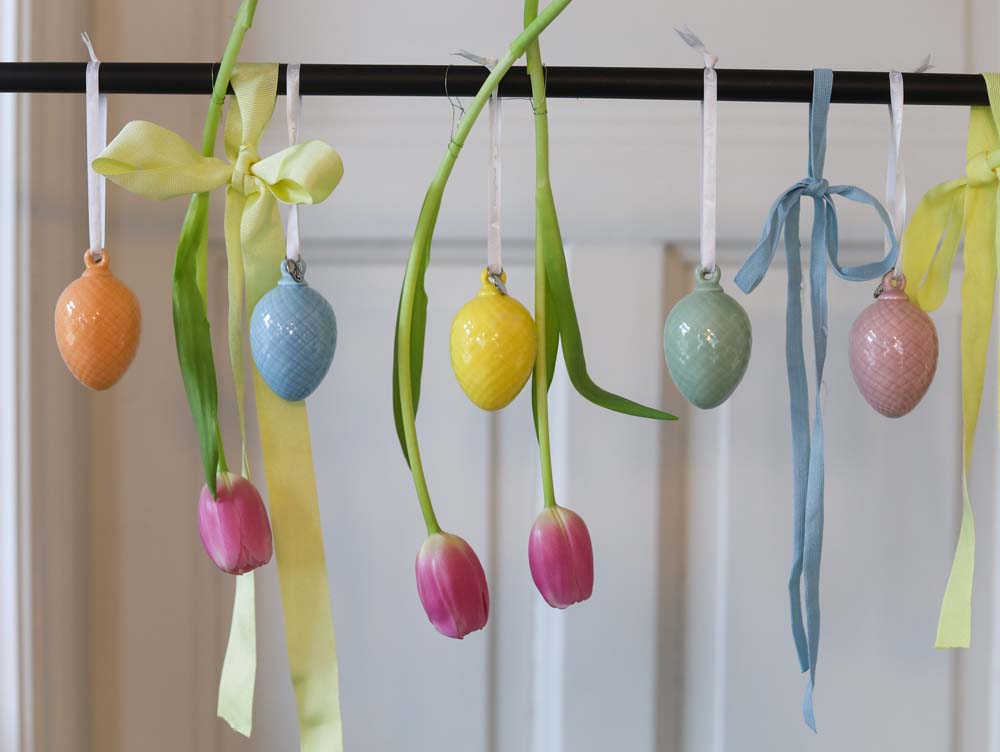 Sett med fem dekorative porselensegg med vakkert ruteformet relieff. Eggene gir tekstur og dybde til påskepynten og er perfekte å kombinere med både fargerik og mer dempet dekor.