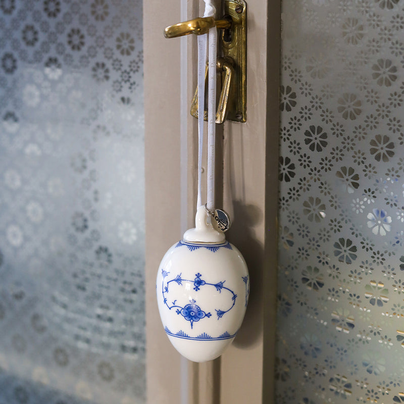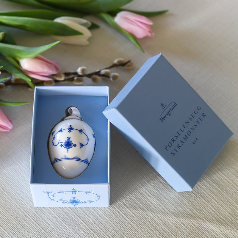 Dekorativt porselensegg med Porsgrunds Porselænsfabriks tradisjonelle Stråmønster, en tidløs klassiker siden første brenning i 1887. Det elegante blå mønsteret gir en raffinert og nostalgisk påskestemning.