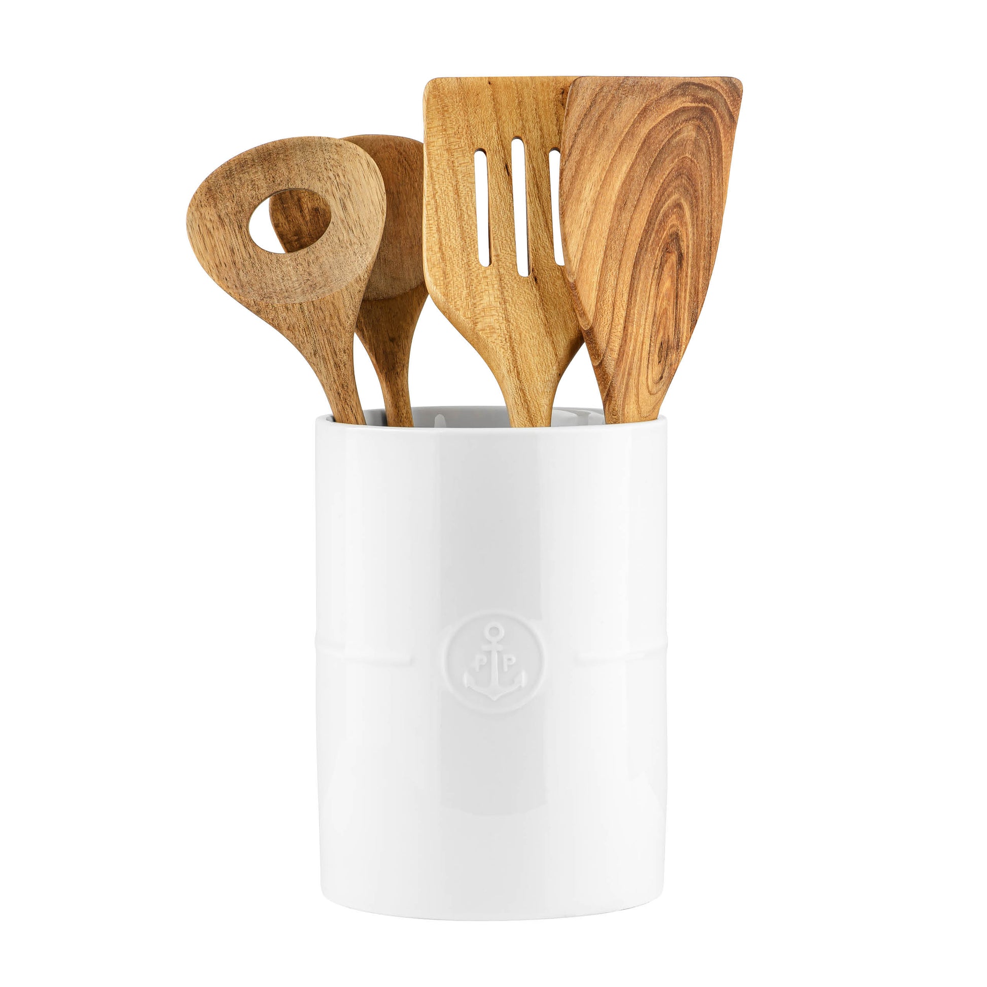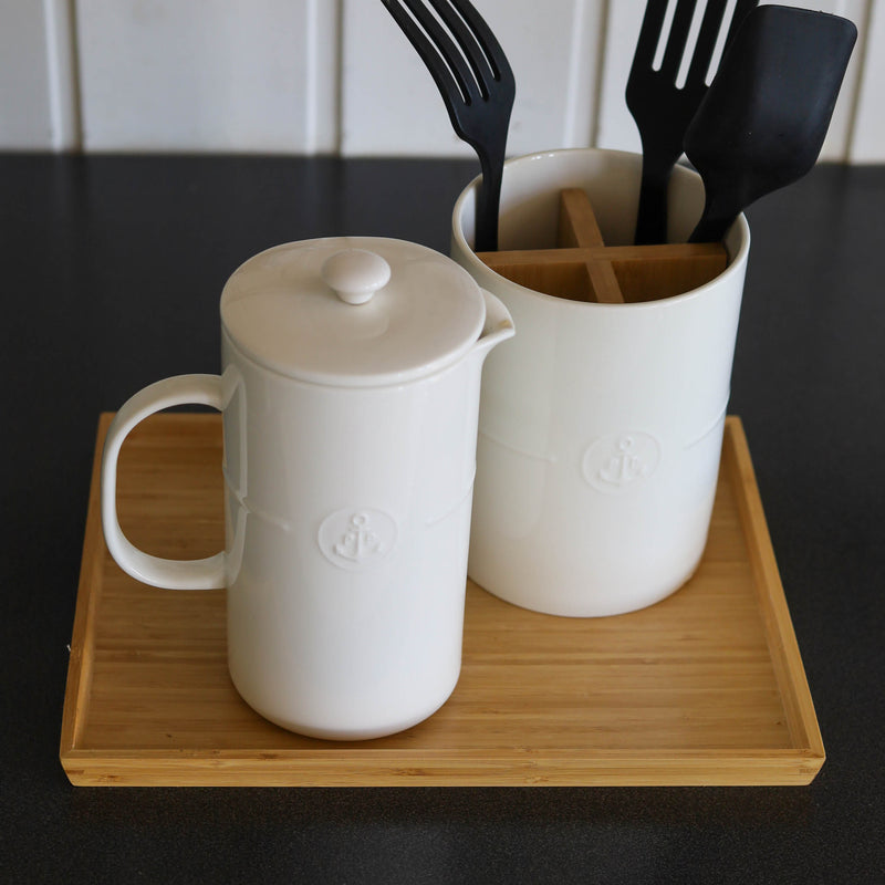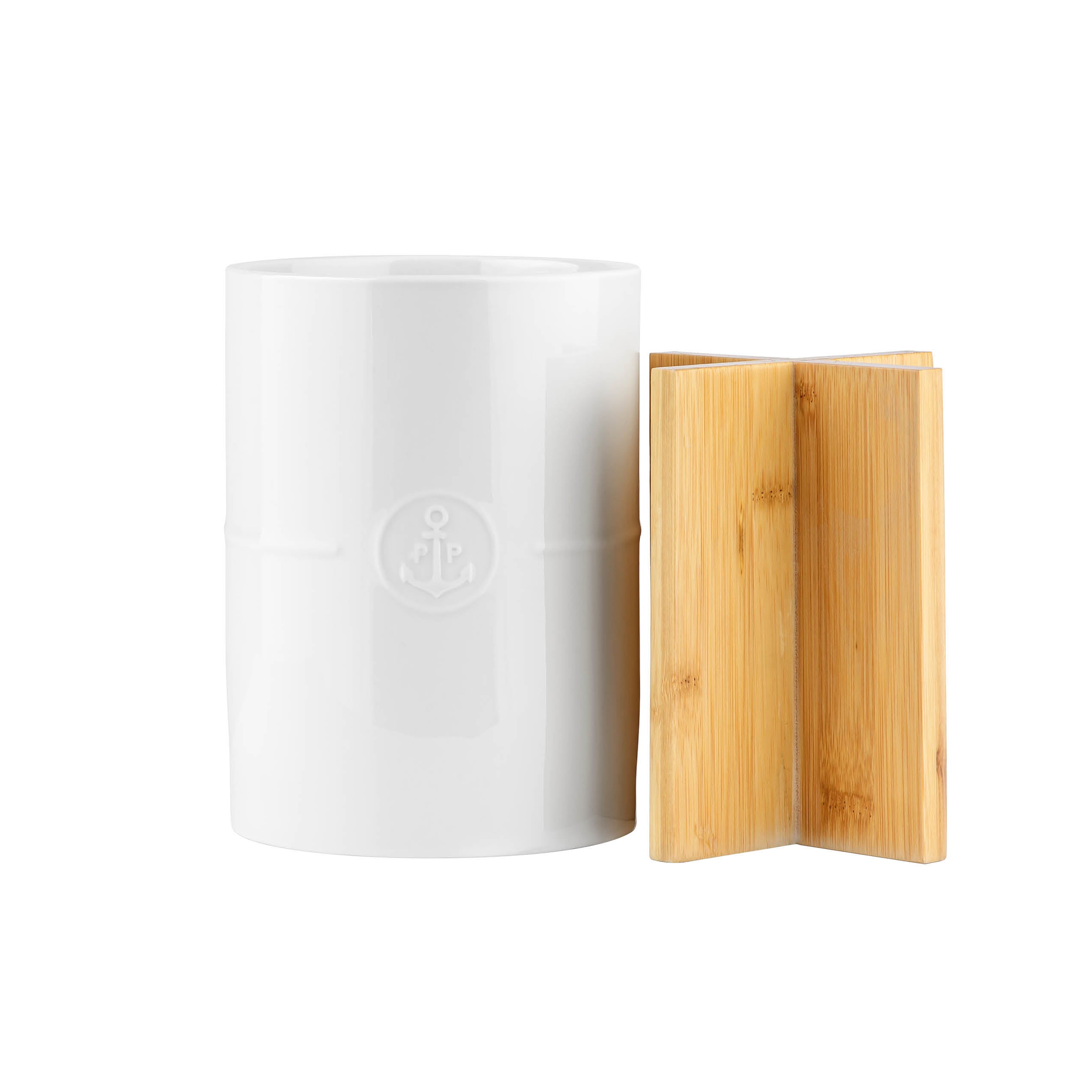 Den hvite redskapskrukken i ildfast porselen er et praktisk og stilrent tilskudd til kjøkkenbenken. Med en innsats i akasietre hjelper den deg med å holde orden på kjøkkenredskapene dine, samtidig som den tilfører et naturlig og elegant uttrykk.