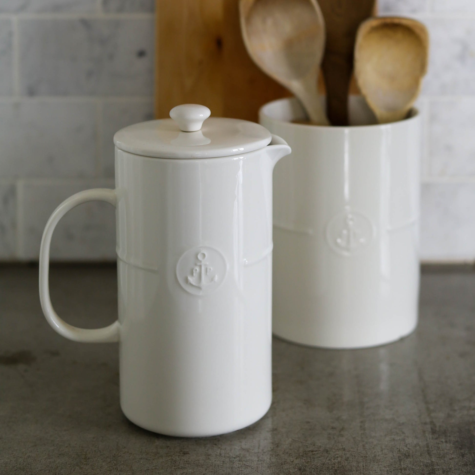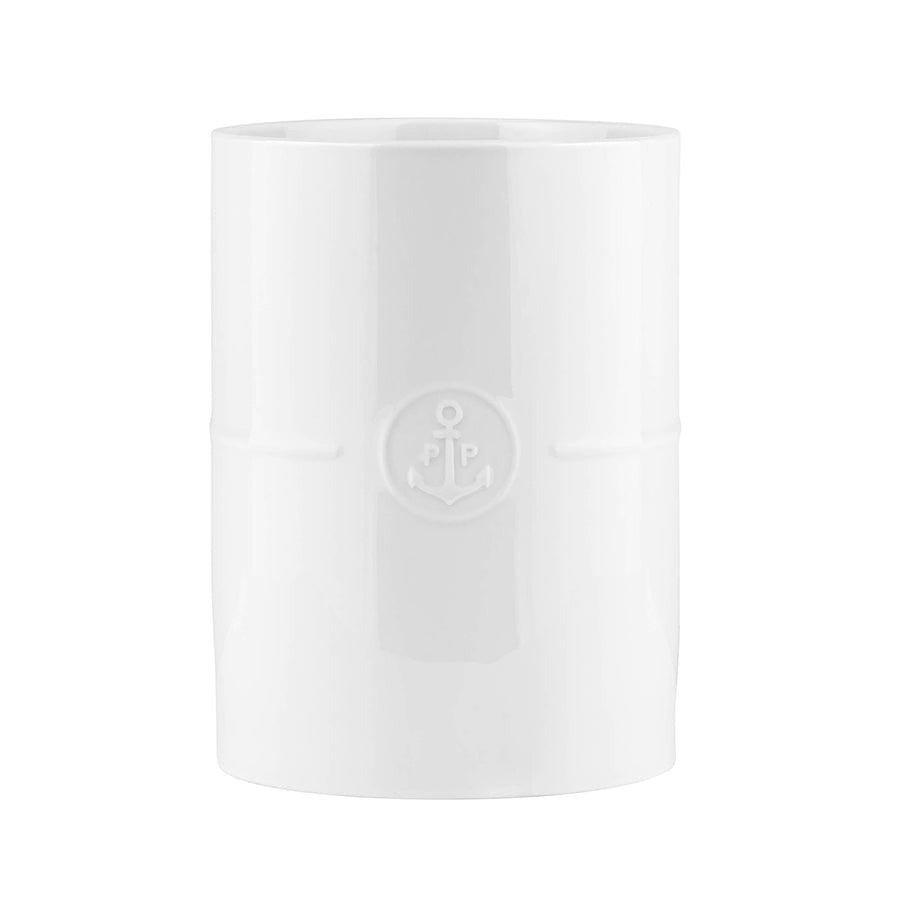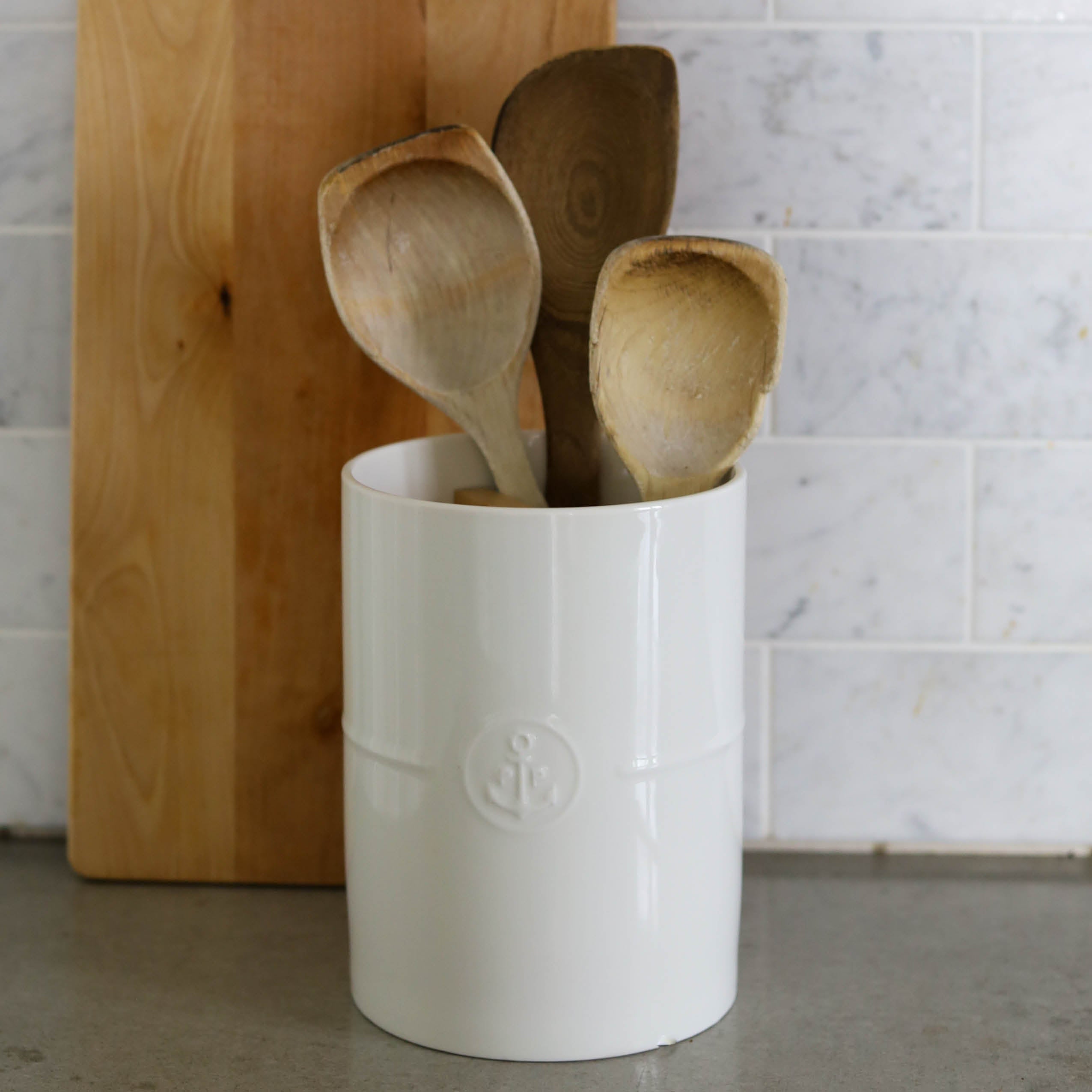 Den hvite redskapskrukken i ildfast porselen er et praktisk og stilrent tilskudd til kjøkkenbenken. Med en innsats i akasietre hjelper den deg med å holde orden på kjøkkenredskapene dine, samtidig som den tilfører et naturlig og elegant uttrykk.