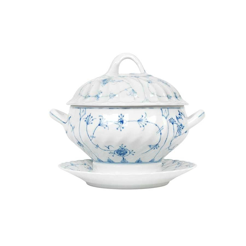 Sauseterrinen i Bogstad Stråmønster er en elegant og funksjonell serveringsdel, bestående av terrin, lokk og et lite underfat. Alle tre delene er utsmykket med det ikoniske håndmalte stråmønsteret, noe som gir terrinen et gjennomført og tidløst design.