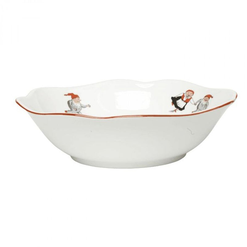Dette klassiske serveringsfatet er perfekt for poteter, grønnsaker eller annen tilbehør. Det er et must til julemiddagen for å presentere maten på en elegant måte. Fatet er dekorert med rødt bånd og søte nisser, noe som gir et festlig preg til borddekkingen.