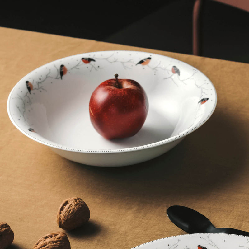 Dompap serveringsfat dyp, 25 cm, er perfekt for å servere dine favorittretter. Den dype utformingen gjør det ideelt for salater, pastaretter, grønnsaker eller varme gryter. Med sitt elegante design i benporselen og detaljer i ekte platina, tilfører dette fatet en touch av luksus til borddekkingen. Serveringsfatet harmonerer utmerket med andre deler i Dompap-serien og bidrar til å skape en koselig og innbydende atmosfære til vinterens sammenkomster.