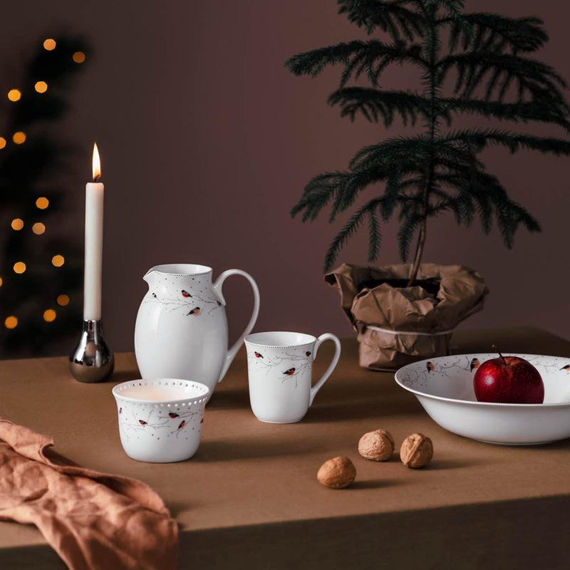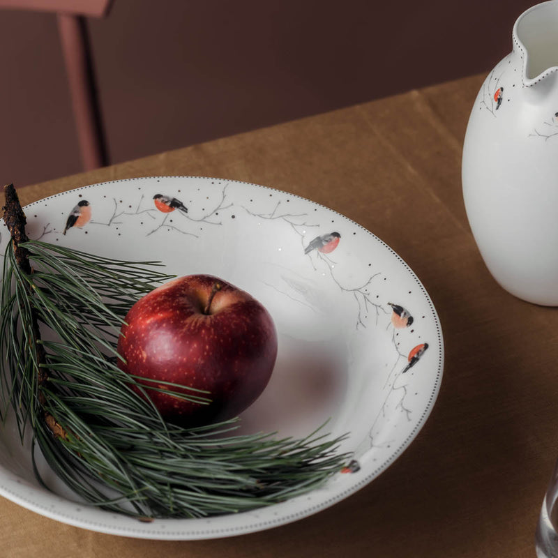 Hva er vel koseligere enn en liten, lubben, rød fugl på en rimfrostet gren? Dompap-serviset er utviklet med den norske vinteren i tankene og er det perfekte vinterservise til julehøytiden. Den fargesterke dompapen skinner på dette elegante penserviset i benporselen, satt mot et bakteppe av blekt vinterlys og nakne grener. Med små, luksuriøse detaljer i ekte platina tilfører Dompap-serviset både varme og eleganse til ethvert dekket bord. Serviset er designet av Maud Gjeruldsen Bugge og laget for å skape koselige stunder.