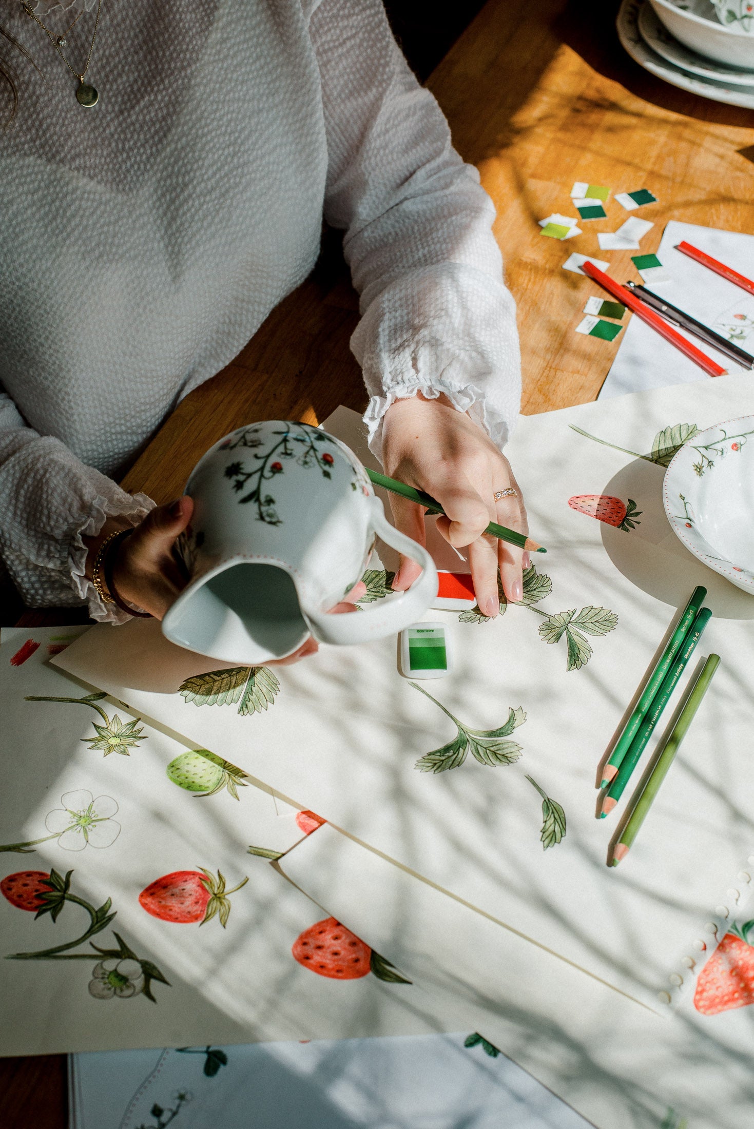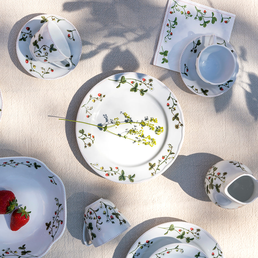 Jordbæreng er et nostalgisk sommerservise som er inspirert av barndommens somre og små, velduftende markjordbær. Med Jordbæreng kan du dekke de nydeligste jordbærbord, enten du serverer jordbær med vaniljesaus, inviterer til sommermat på terrassen eller skal servere kaffe og kake i hagen.