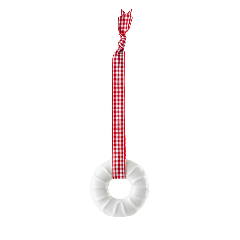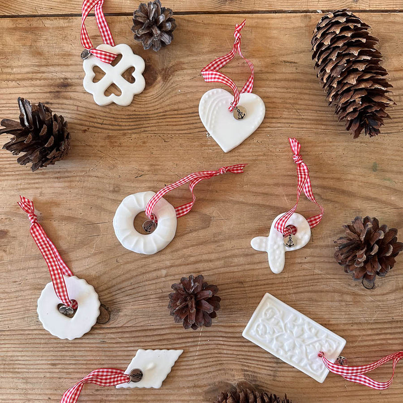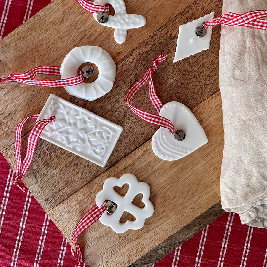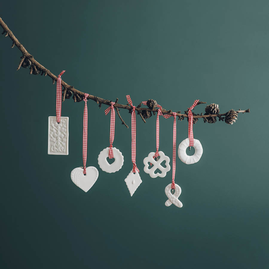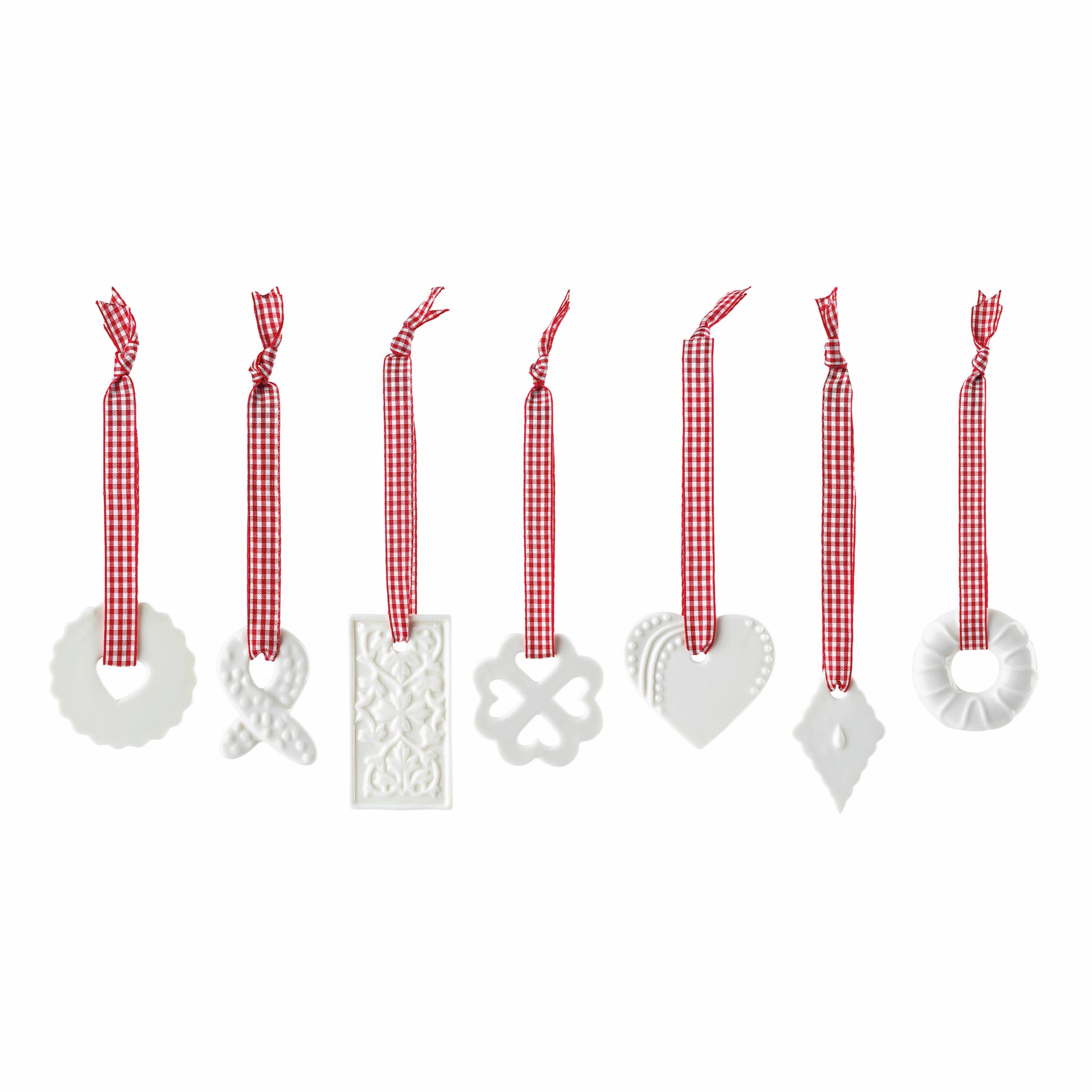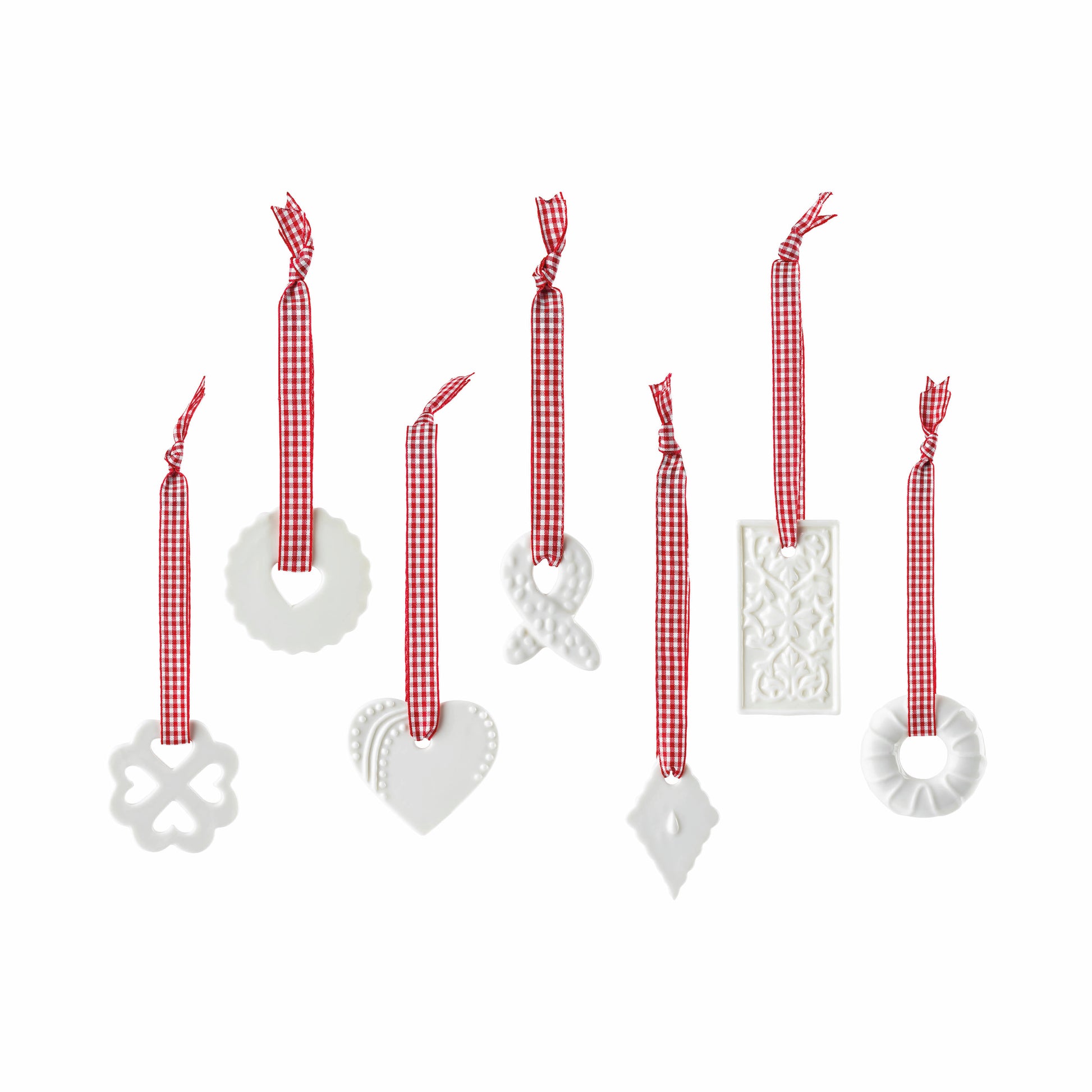Oppdag vår sju slag til jul, en samling av hvite porselenskaker med rutete silkebånd for å henge på treet eller i vinduskarmen. Tidligere var det en tradisjon å ha sju slag med julekaker i boks når julen ringes inn. Selv om antallet ikke er like viktig i dag, er det fortsatt mange som setter pris på denne fine tradisjonen.