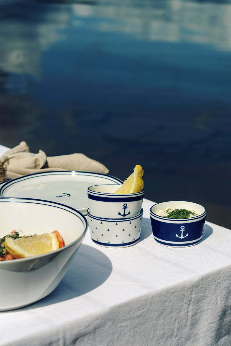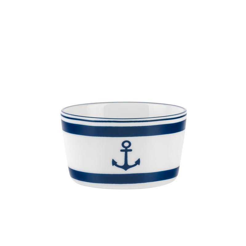 Skålen på 8,5 cm med blå rand fra Porsgrund Maritimt servise er en delikat og anvendelig del av den Maritime serien. Den enkle blå randen gir et klassisk uttrykk som passer til både hverdagsbruk og festlige anledninger ved sjøen. Perfekt til servering av småretter, dipper, bær, eller som en del av frokostbordet med syltetøy for eksempel.